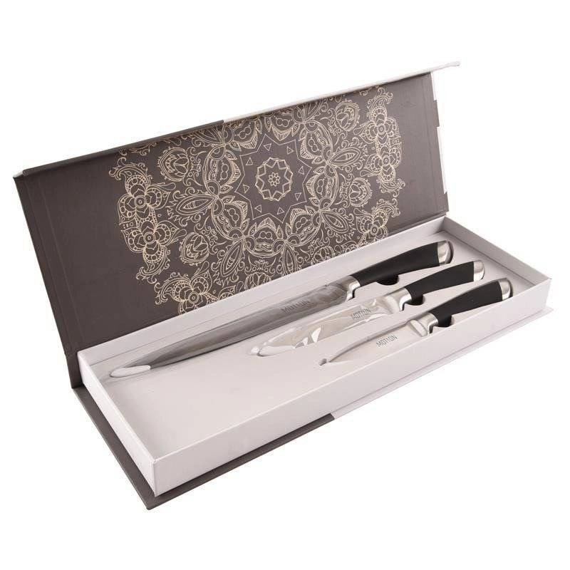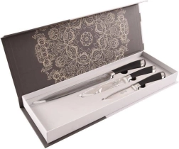 Praktická sada tří kuchyňských nožů MOTION z kvalitní nerezové oceli pro přesné krájení ovoce, zeleniny, masa i pečiva. Nabízí dlouhotrvající ostrost, ergonomické protiskluzové rukojeti a univerzální využití v domácnosti i gastronomii.