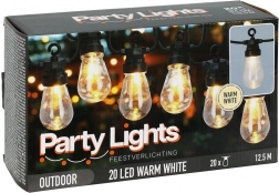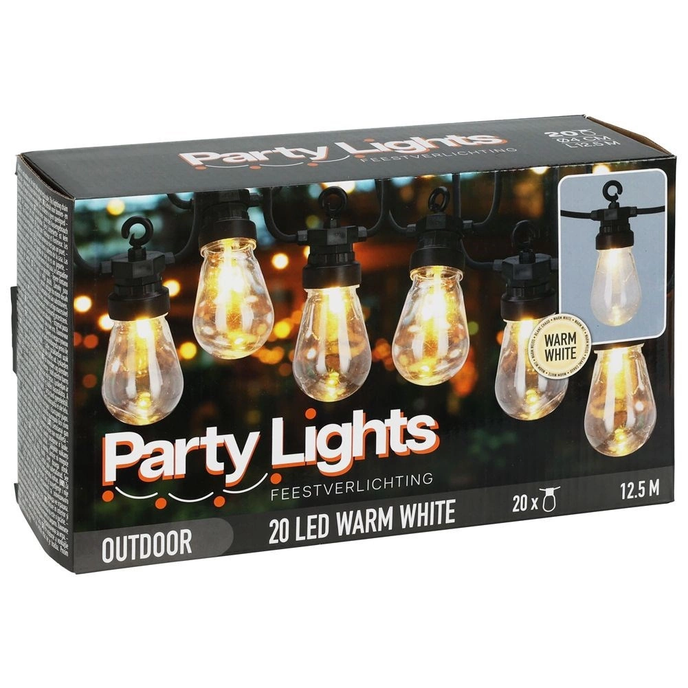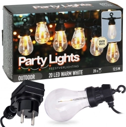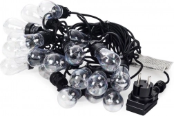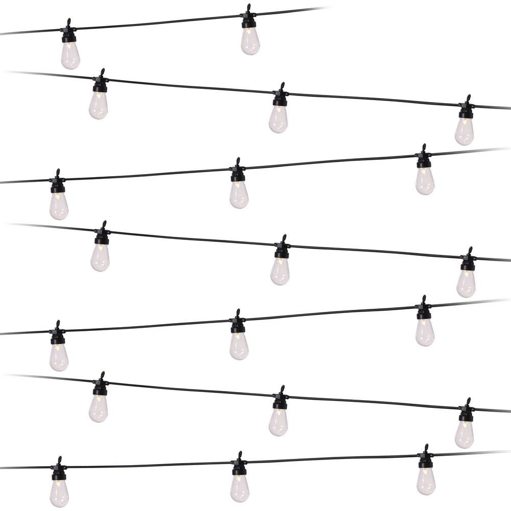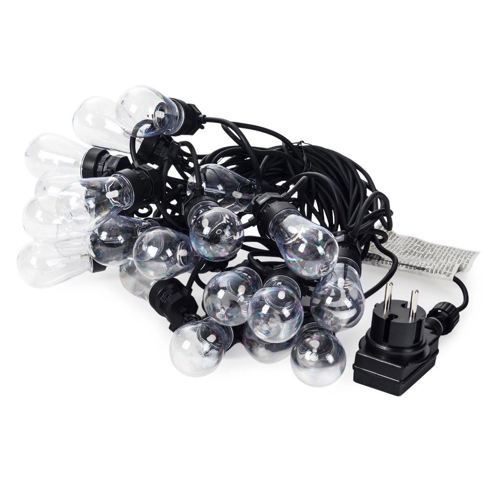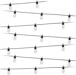 Stylová světelná girlanda s délkou 12,5 m a 20 čirými LED žárovkami vytvoří útulnou atmosféru na balkoně, terase i v zahradě. Nabízí neutrální barvu světla, odolnost IP44 pro venkovní použití a praktické háčky pro snadné zavěšení. Díky 3m přívodnímu kabelu a rozestupům 50 cm mezi žárovkami je ideální pro dekorativní osvětlení posezení, párty i svateb.