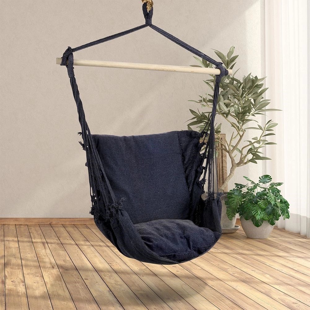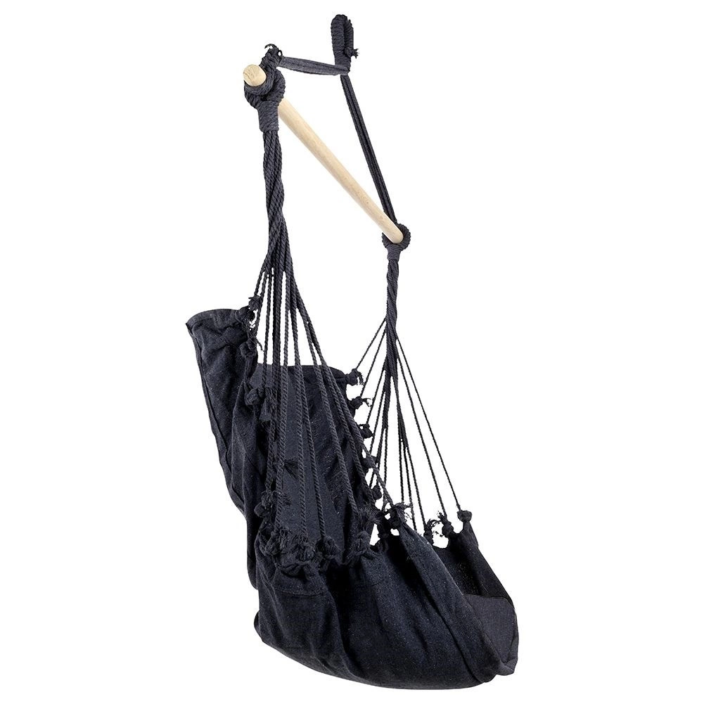 Kvalitní tkanina ze směsi 60 % bavlny a 40 % polyesteru je příjemná na dotek a odolná proti opotřebení. Pevná dřevěná rozpěra o délce 90 cm udržuje sedák otevřený a vzdušný, zatímco robustní pletené šňůry zajišťují bezpečné zavěšení.