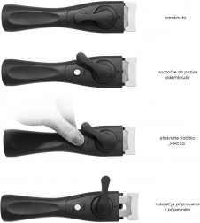 Vhodné pro plyn, elektřinu, sklokeramiku, halogen i indukci. Po sejmutí rukojeti lze pánve použít v troubě a servírovat rovnou na stůl.