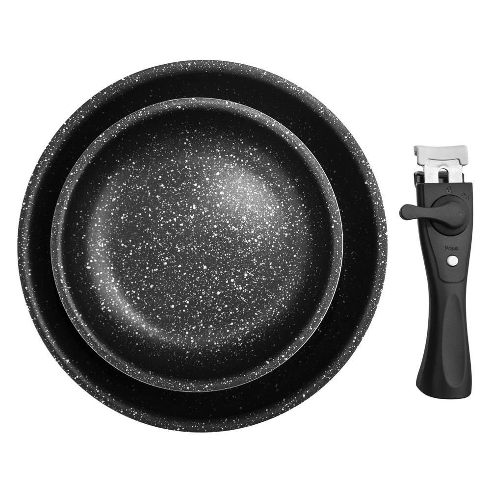 Praktická sada dvou pánví s odnímatelnou rukojetí pro úsporné skladování a snadné vaření. Odolné hliníkové tělo s nepřilnavým granitovým povrchem bez PFOA a PTFE zajistí rovnoměrné rozložení tepla, vaření s minimem tuku a rychlé, úsporné smažení na všech typech sporáků včetně indukce. Vhodné do trouby, myčky i pro skladování v lednici.