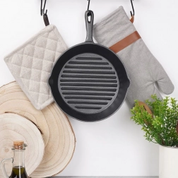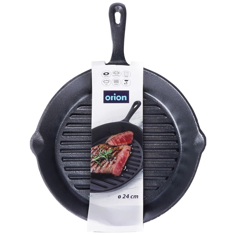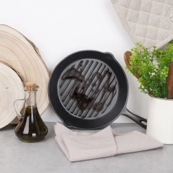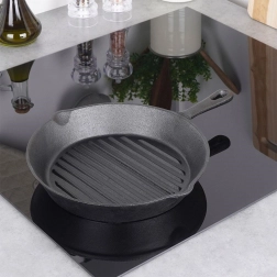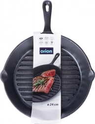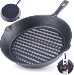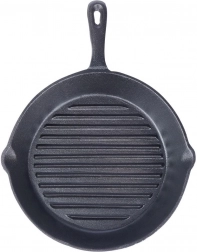 Robustní litinová grilovací pánev o průměru 24 cm pro dokonale opečené steaky, zeleninu i brambory. Díky masivní konstrukci skvěle akumuluje teplo, vytváří výrazné mřížkové stopy a je vhodná na všechny typy sporáků včetně indukce i do trouby. Dvoustupňové výlevky usnadní slévání šťávy, vysoká odolnost vůči teplu zajistí dlouhou životnost a univerzální použití oceníte doma i na grilu či u ohně.