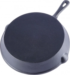 Pánev je univerzální – hodí se na plyn, elektřinu, sklokeramiku, halogen i indukci, stejně tak do trouby či přímo na gril nebo otevřený oheň. Praktické dvě výlevky a pohodlné ucho usnadňují manipulaci i servírování.