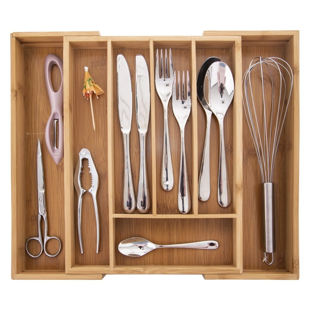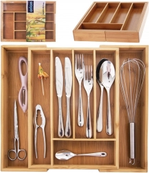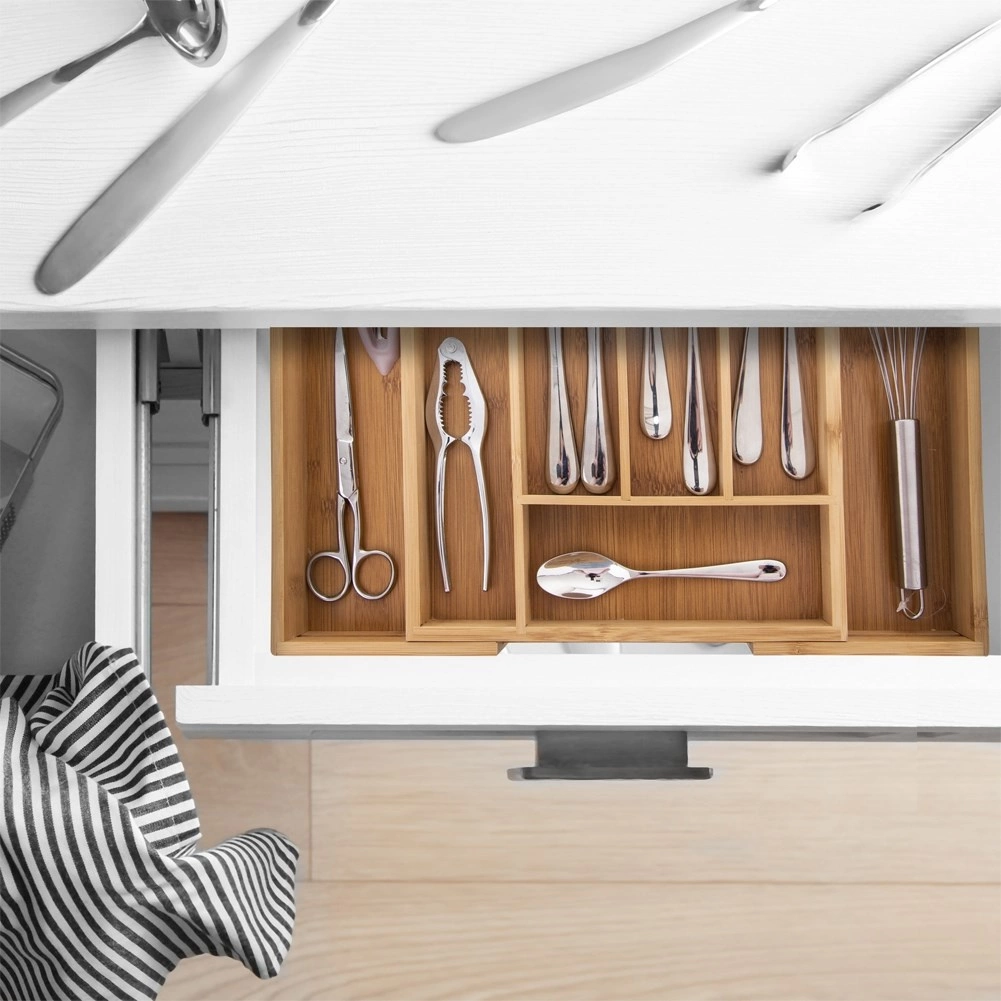 Bambusové dřevo je odolné proti vlhkosti a deformacím, neabsorbuje pachy a snadno se čistí. Organizér nabízí 5 až 7 přihrádek dle zvoleného rozšíření, takže si vnitřní uspořádání přizpůsobíte svým potřebám – od vidliček a lžiček až po škrabky, metličky či kuchyňské nůžky.