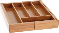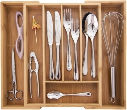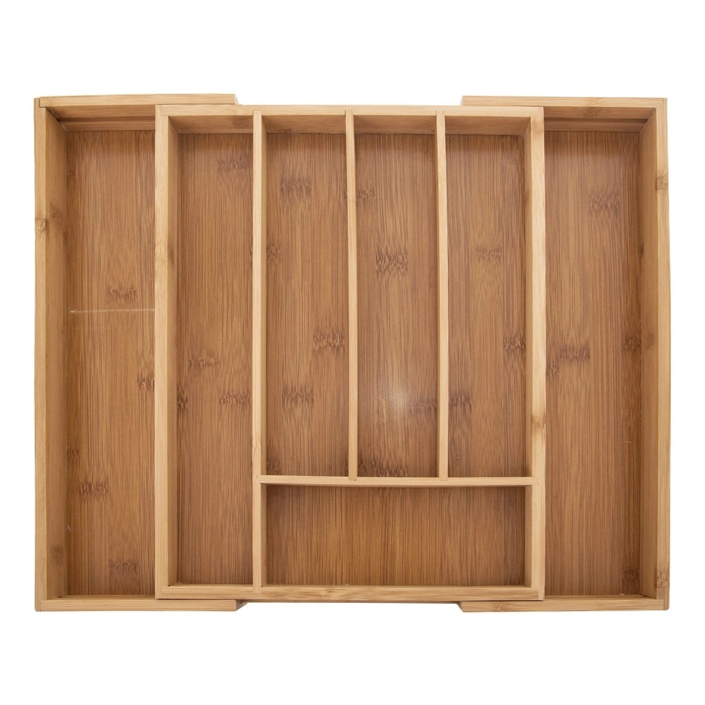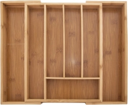 Praktická vložka do zásuvky z přírodního bambusu vám pomůže elegantně roztřídit příbory i drobné kuchyňské náčiní. Díky bočně roztažitelným částem snadno využijete každý centimetr prostoru a vše zůstane na svém místě – přehledně a vždy po ruce.
