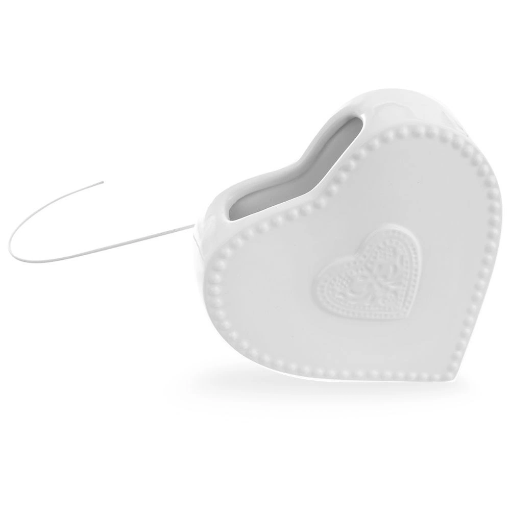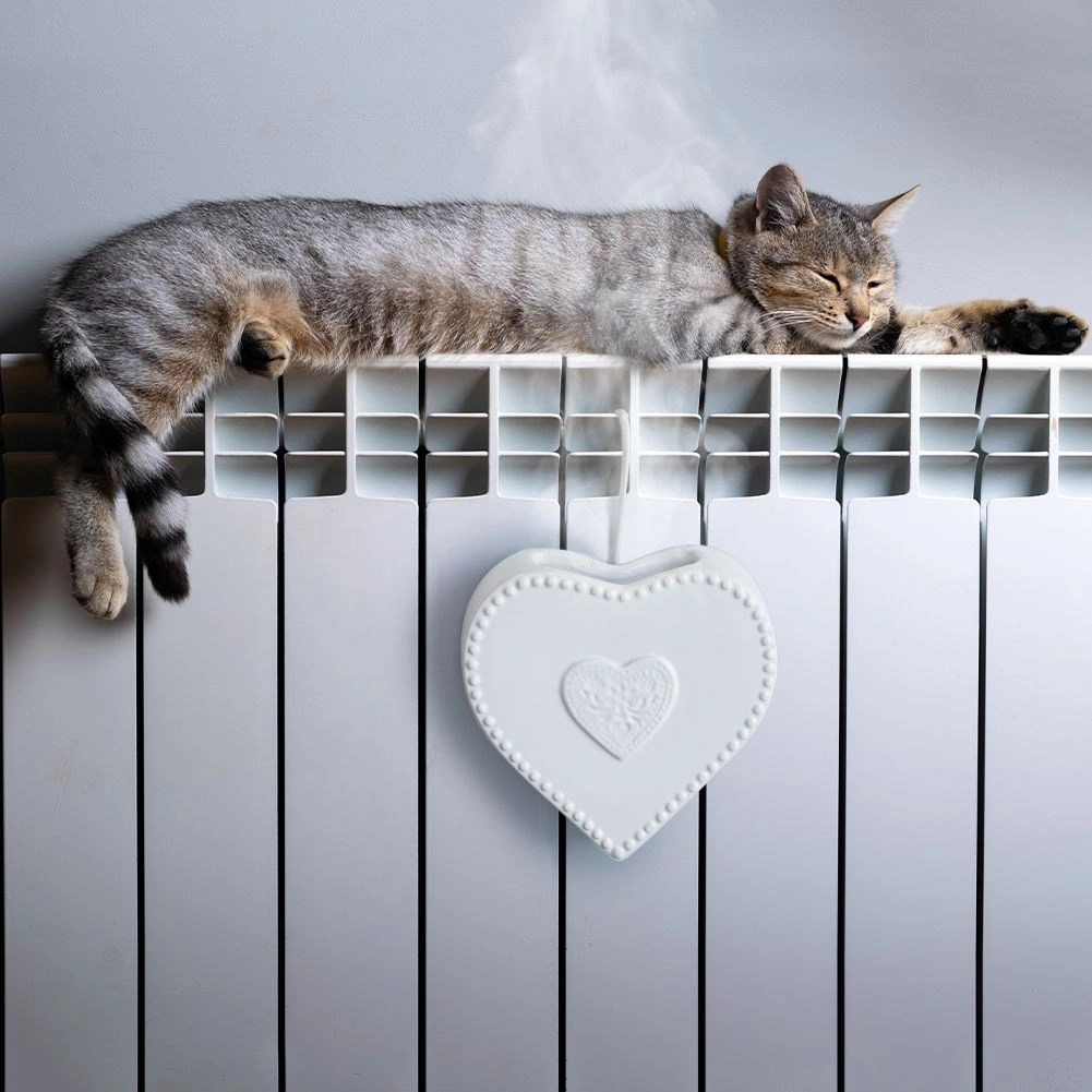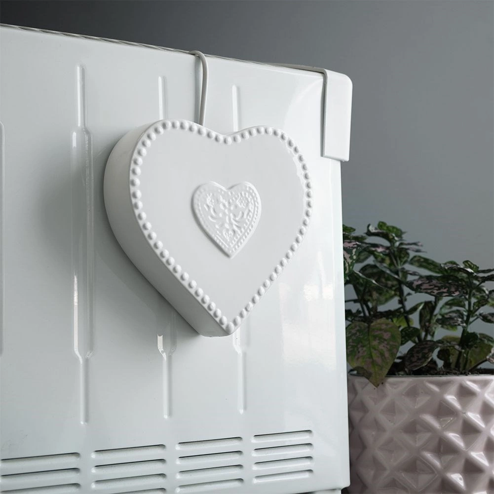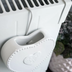 Tento bílý keramický zvlhčovač na radiátor s jemným reliéfem srdce je praktickým řešením proti suchému vzduchu v období vytápění. Stačí jej naplnit vodou a zavěsit na topení pomocí kovového háčku – voda se pozvolna odpařuje a zlepšuje klimapohodu v místnosti.