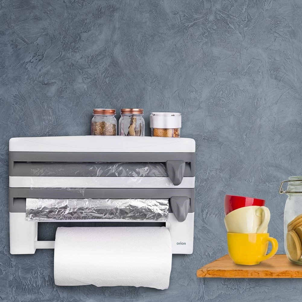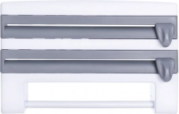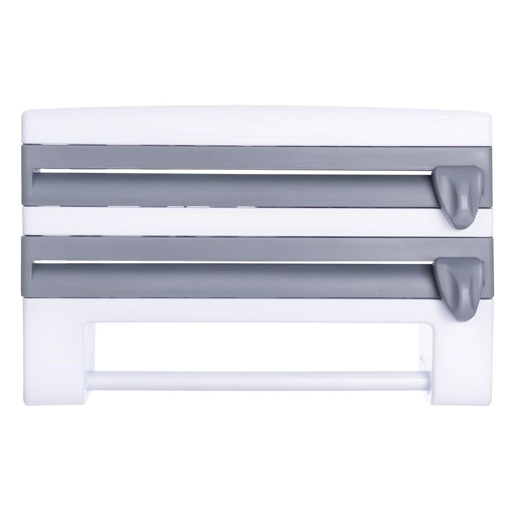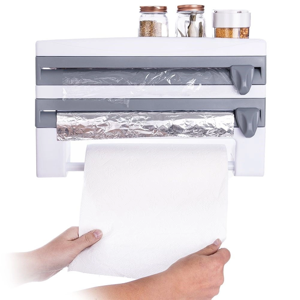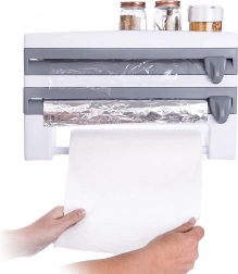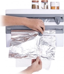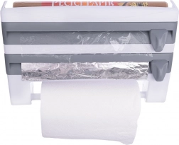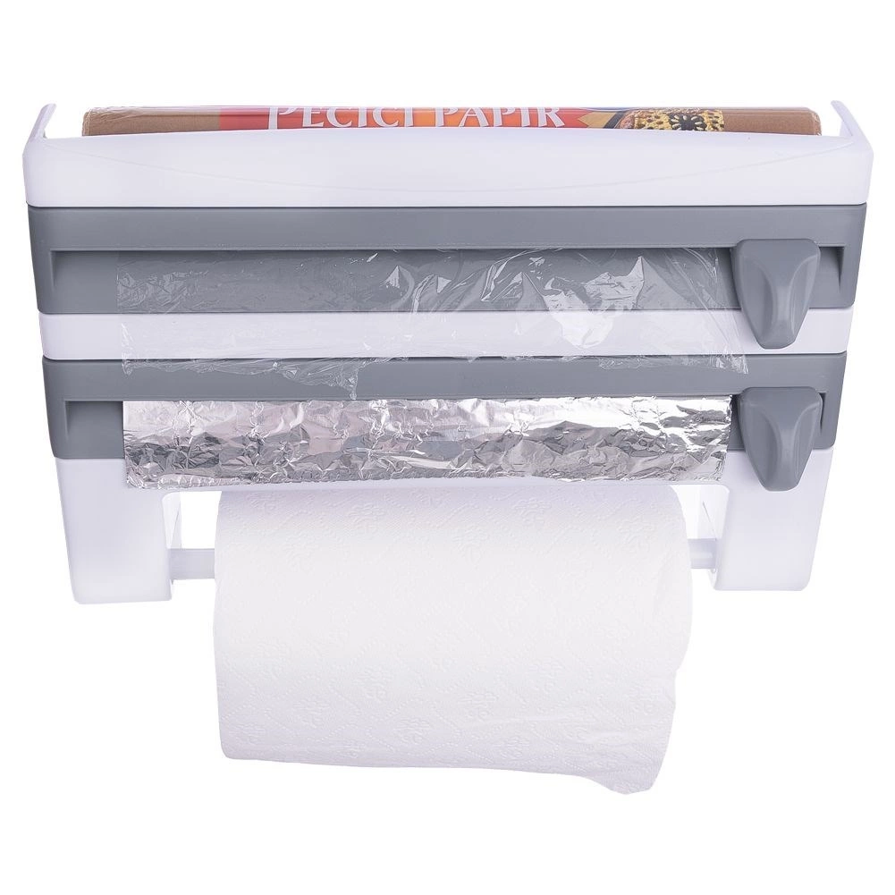 Nástěnný dávkovač fólií a papírových utěrek 3v1 je chytré řešení pro každou kuchyni i gastro provoz. Dva samostatné zásobníky s integrovanými noži umožňují plynulé odvíjení a bezpečné přesné ořezání potravinové a hliníkové fólie. Spodní tyč udrží standardní roli papírových utěrek vždy po ruce, zatímco horní police poskytne místo pro kořenky, pečicí papír či drobné kuchyňské pomůcky.