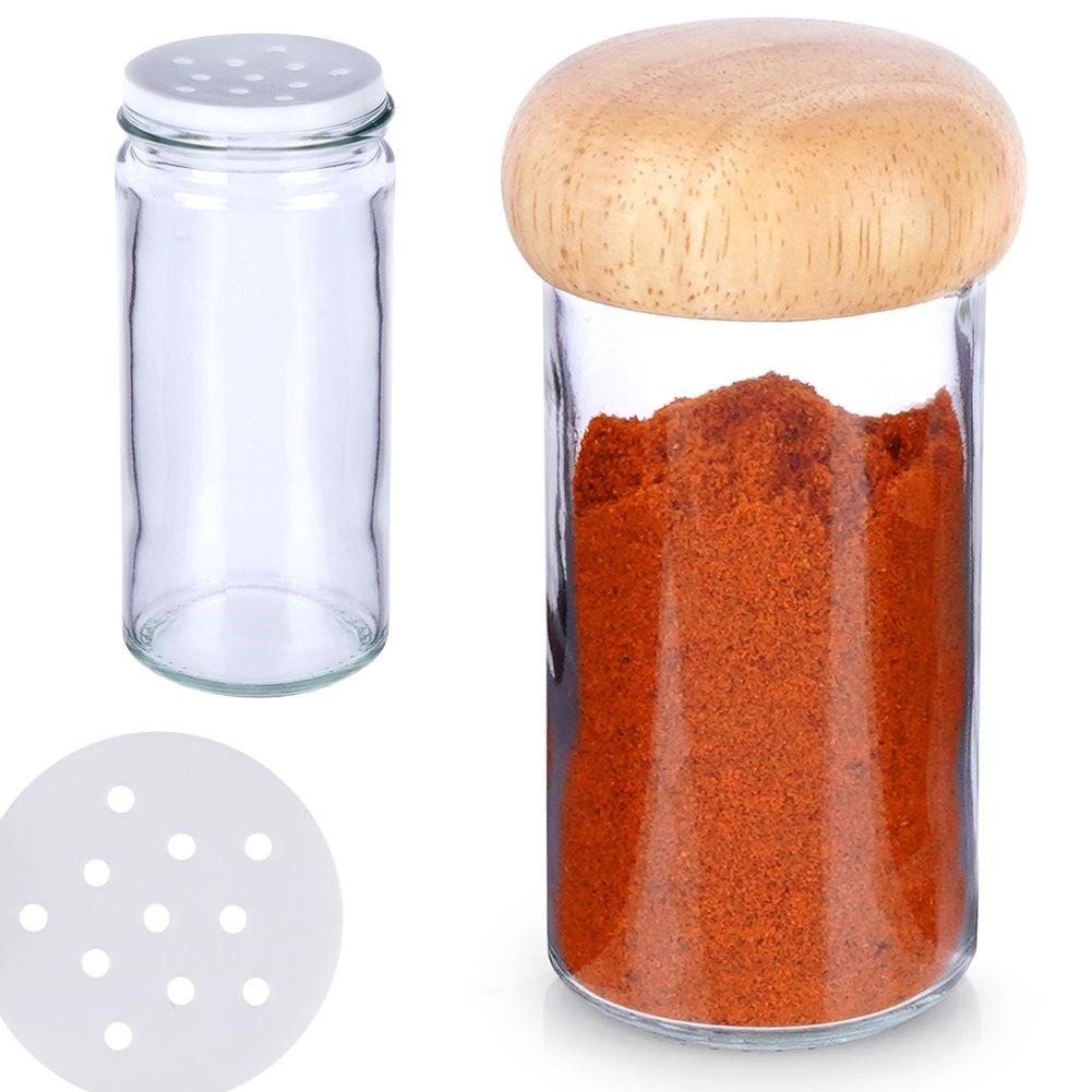 Čiré sklo pro perfektní přehled o obsahu a dřevěné šroubovací víčko, které pomáhá chránit koření před vlhkostí a prodlužuje jeho čerstvost.