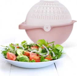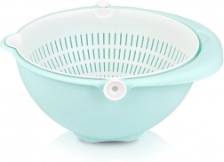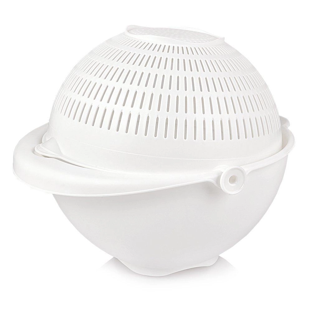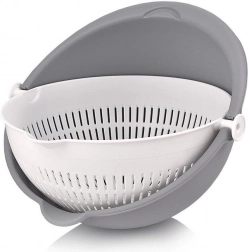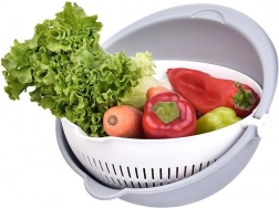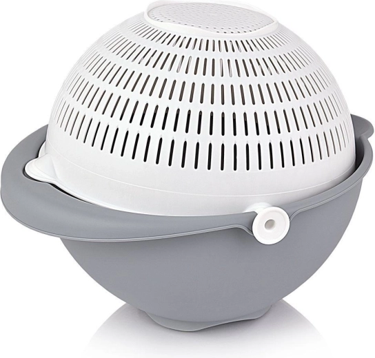 Objevte chytré řešení pro každodenní kuchyňské úkony. Otočný cedník uložený v misce umožní rychlé proplachování a odvod vody bez nutnosti přesypávání surovin. Při naklonění zůstává cedník vodorovně, takže obsah je v bezpečí a voda odteče do vnější mísy.