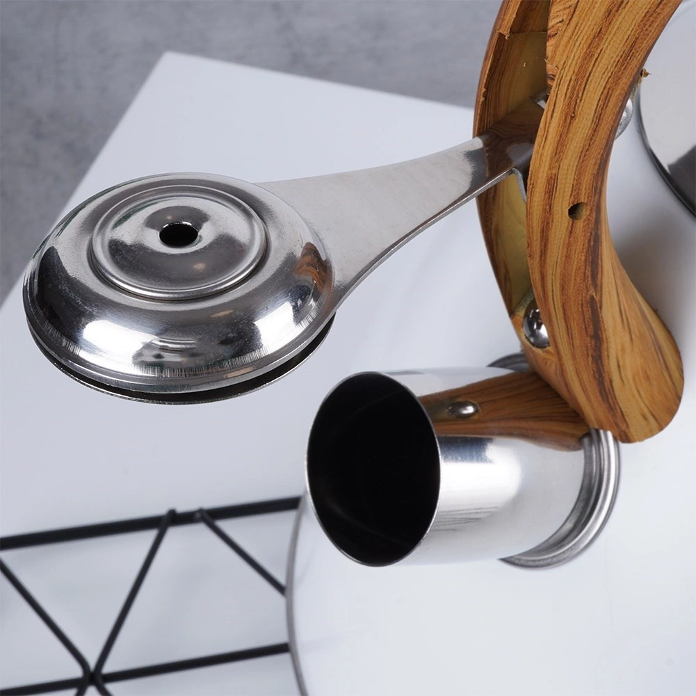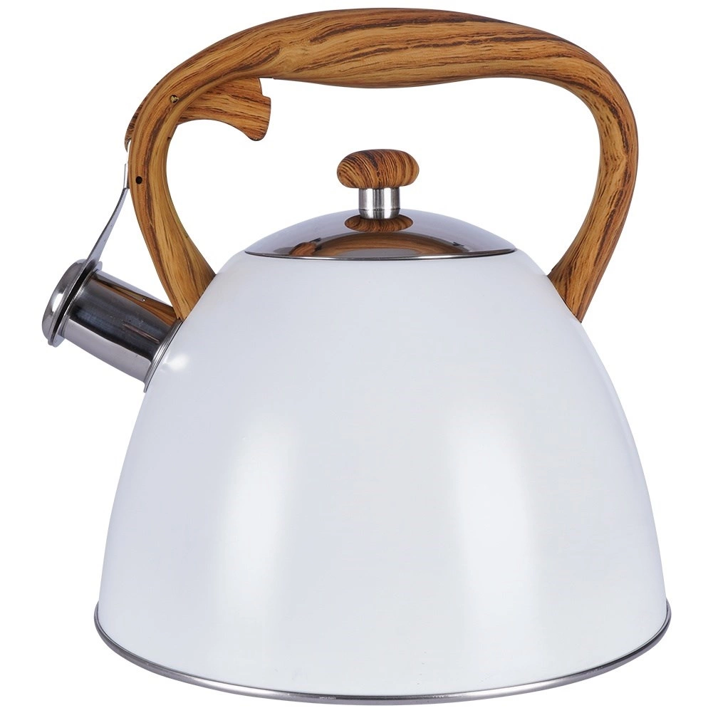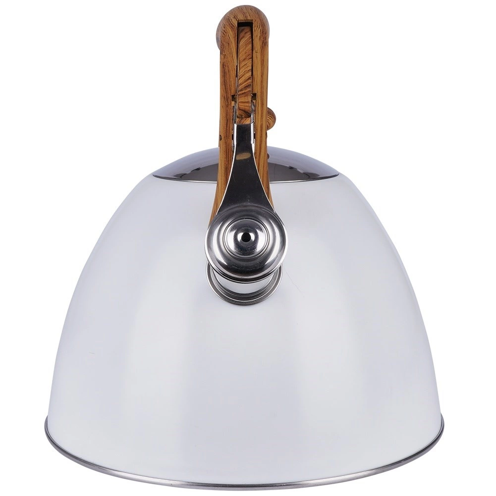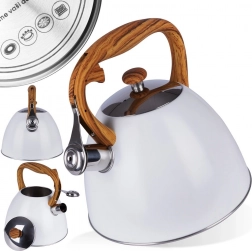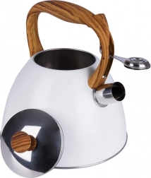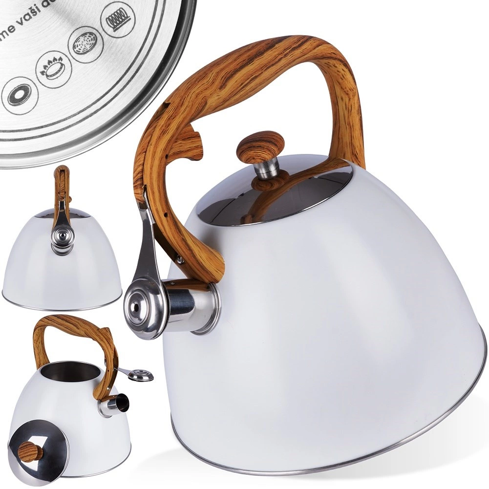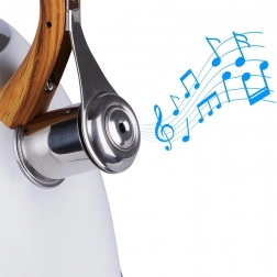 Tato klasická, designově čistá konvice kombinuje odolnou nerezovou ocel s moderním bílým povrchem a pohodlným madlem v dekoru dřeva. Píšťalka s automatickým otevíráním ve rukojeti usnadňuje nalévání, široké víko zase pohodlné doplňování vody a čištění. Díky kvalitnímu materiálu nenarušuje chuť vody a zajistí efektivní přenos tepla.