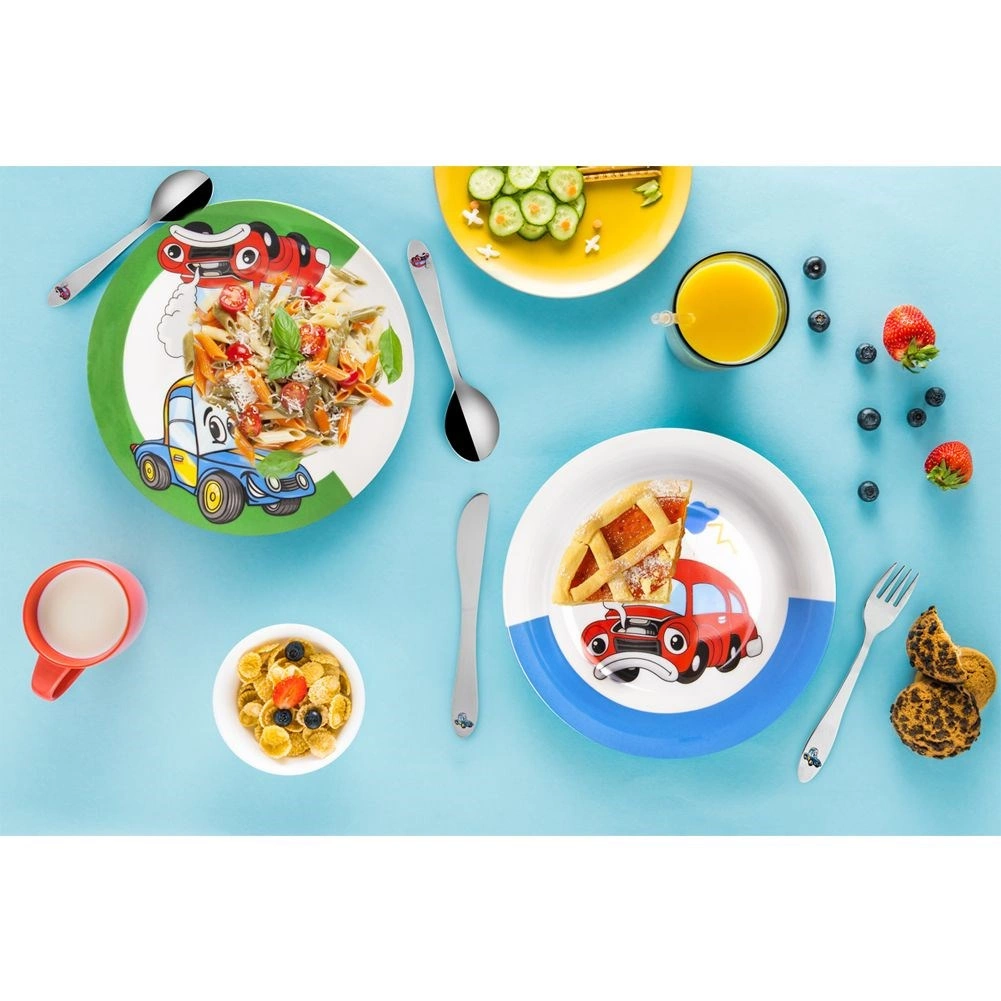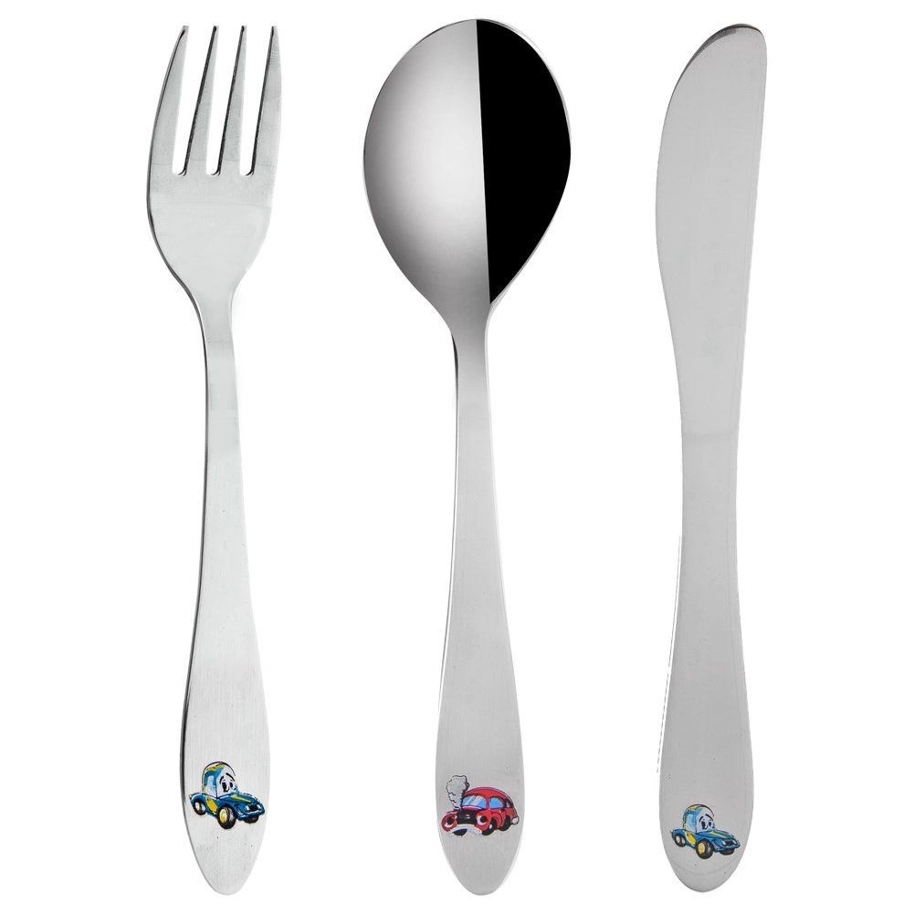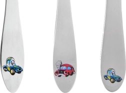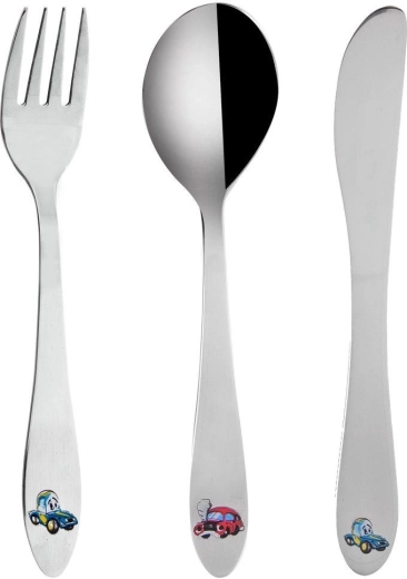 Roztomilá sada dětských příborů s motivem aut je ideální pro první samostatné stolování. Obsahuje vidličku, nůž a lžíci v dětské velikosti, vyrobené z nerezové oceli s barevným dekorem. Příbory jsou bezpečné, lehké a pohodlné do malých ruček – skvělé pro děti od 3 let.