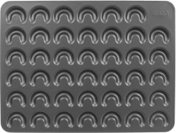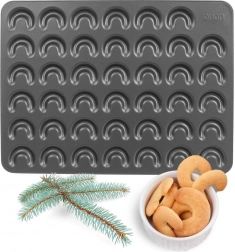 Tato kvalitní plechová forma umožní rychle a efektivně upéct malé rohlíčky s dokonale jednotným tvarem. Nepřilnavá vrstva minimalizuje použití tuku, zabraňuje připečení a usnadňuje vyklápění bez poškození křehkého těsta. Díky rozměrům 42 × 32 × 0,7 cm a 41 dutinám ušetříte čas i energii.