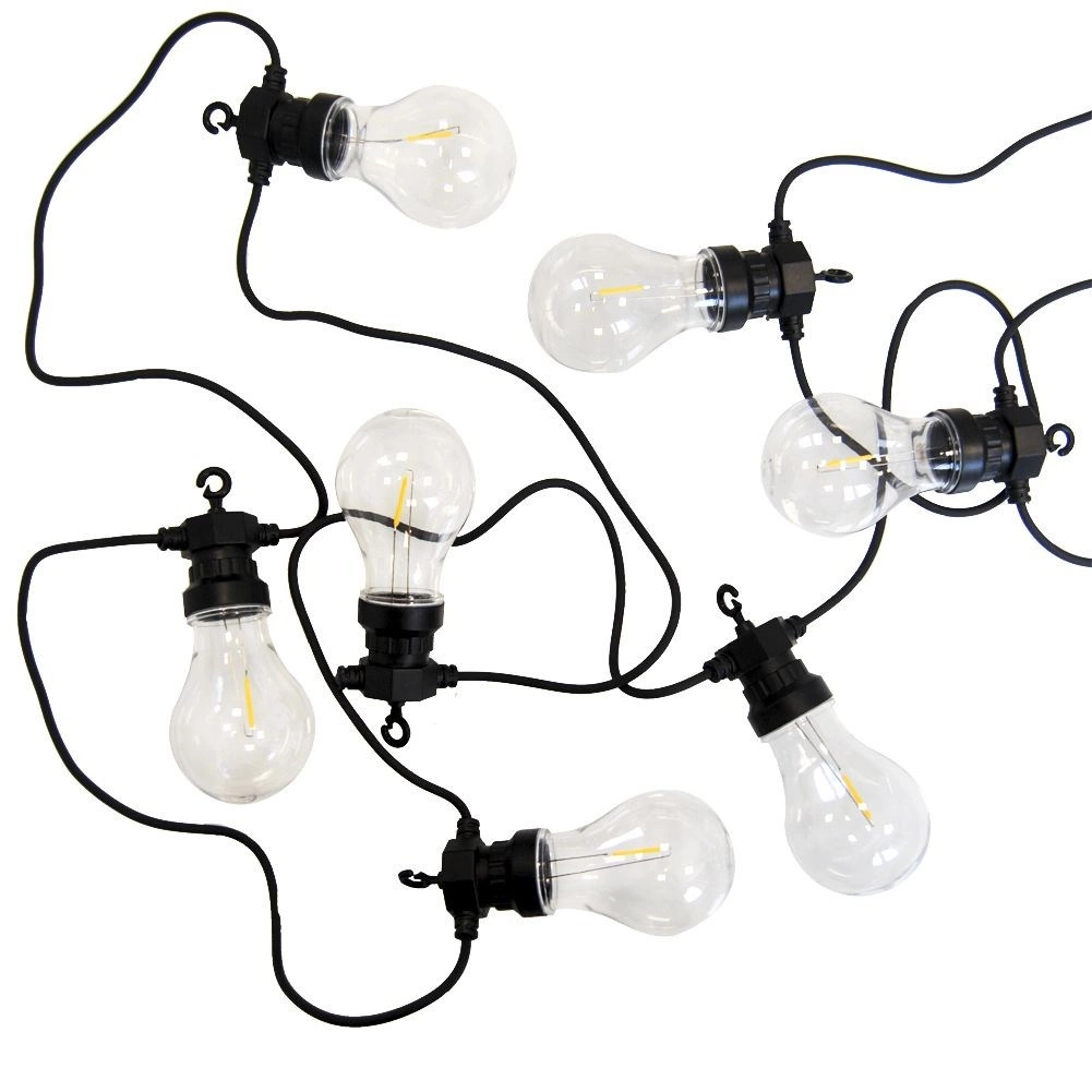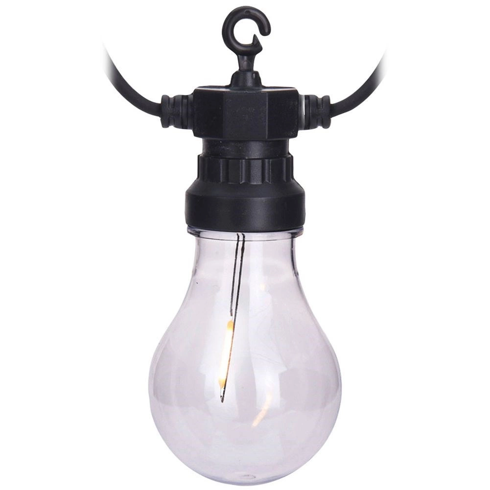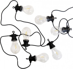 Stylová zahradní LED girlanda o délce 7,5 m s 10 průhlednými LED žárovkami vytváří příjemnou atmosféru na terase, balkoně i v interiéru. Díky krytí IP44 je vhodná pro venkovní použití, má teplé bílé světlo, energeticky úsporný provoz a snadné zavěšení pomocí integrovaných háčků.