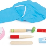 Set je navržen pro realistické hraní na zubaře: obsahuje látkovou roušku a čepici, model zubů, zubní kartáček, pastu, zubní zrcátko a další dřevěné nástroje. Děti si nacvičí správné návyky dentální hygieny, rozvíjí jemnou motoriku, představivost a sociální dovednosti při hře s kamarády.