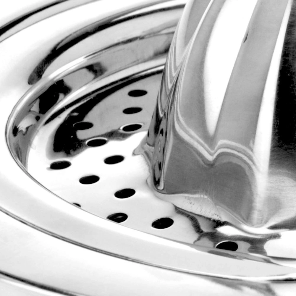 Praktický nerezový odšťavňovač na citrusy s integrovaným sítkem a sběrnou miskou vám umožní lisovat šťávu přímo do nádobky. Robustní provedení z kvalitní nerezové oceli je bezpečné pro potraviny, odolné vůči korozi a snadno se čistí, včetně možnosti mytí v myčce.