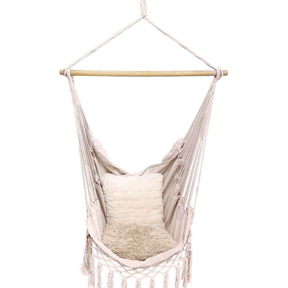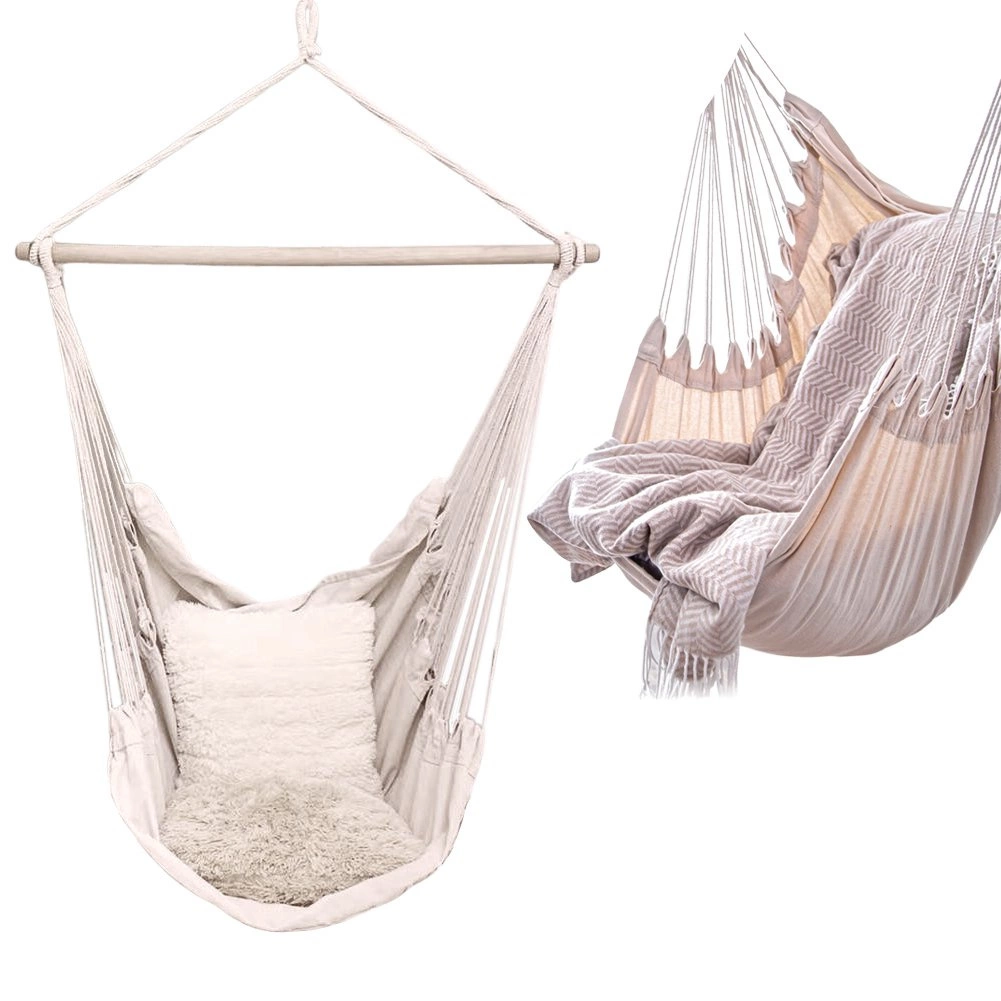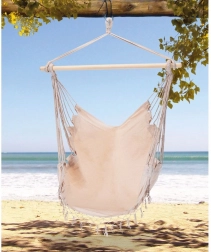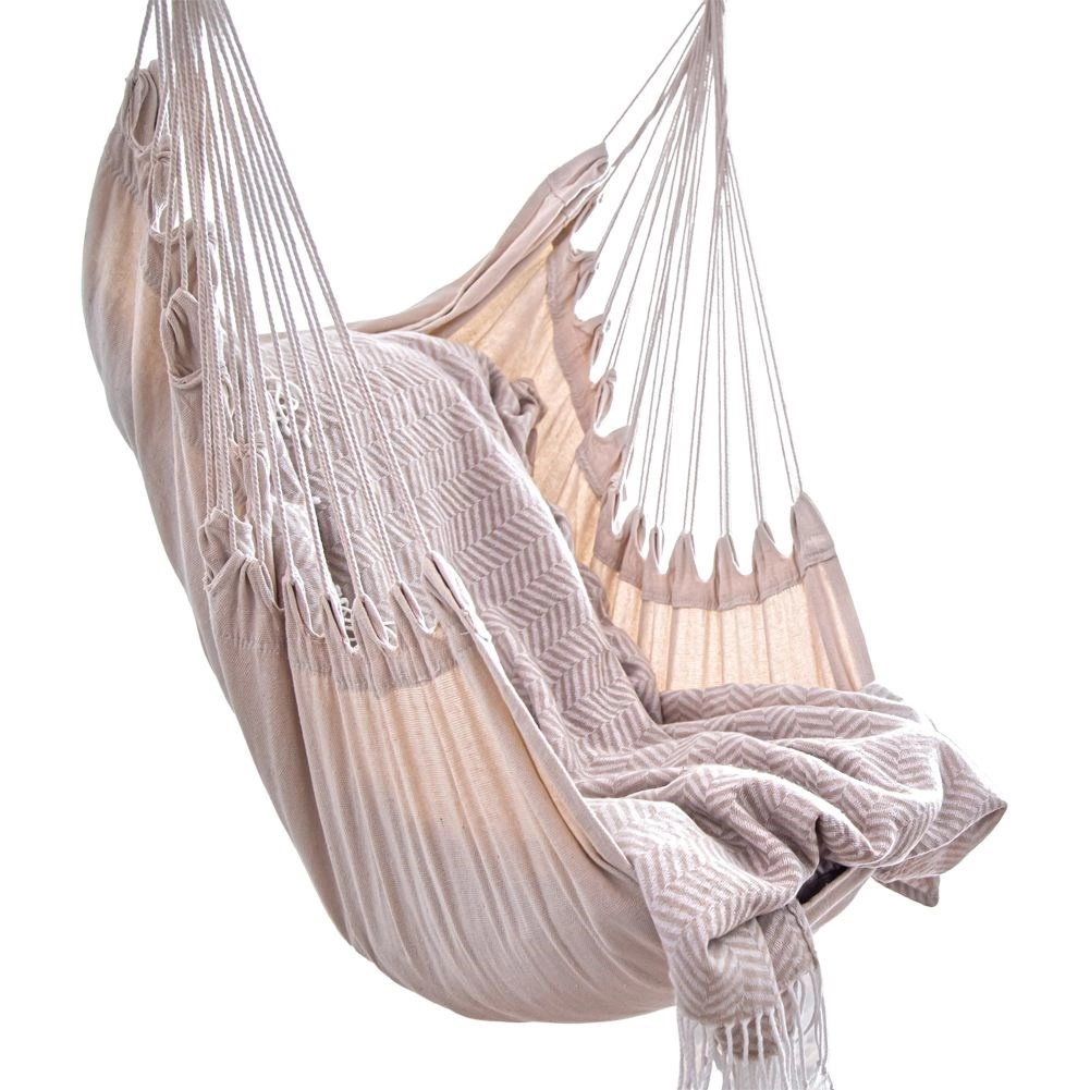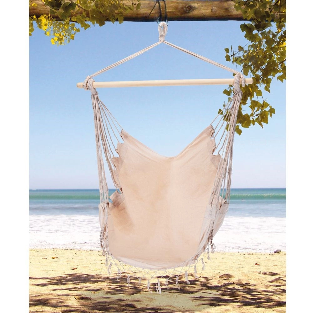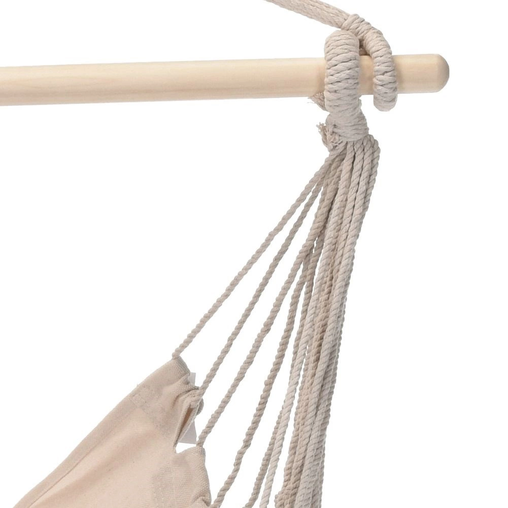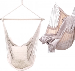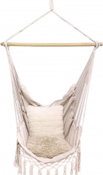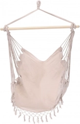 Elegantní závěsné křeslo hamaka v béžové barvě je skvělou volbou pro zahradu, balkon, terasu i interiér. Díky jednomu závěsnému bodu šetří místo a vytvoří vám útulný koutek na čtení i lenošení. Pevná konstrukce se stabilizační dřevěnou tyčí zajišťuje pohodlné sezení a bezpečné houpání.