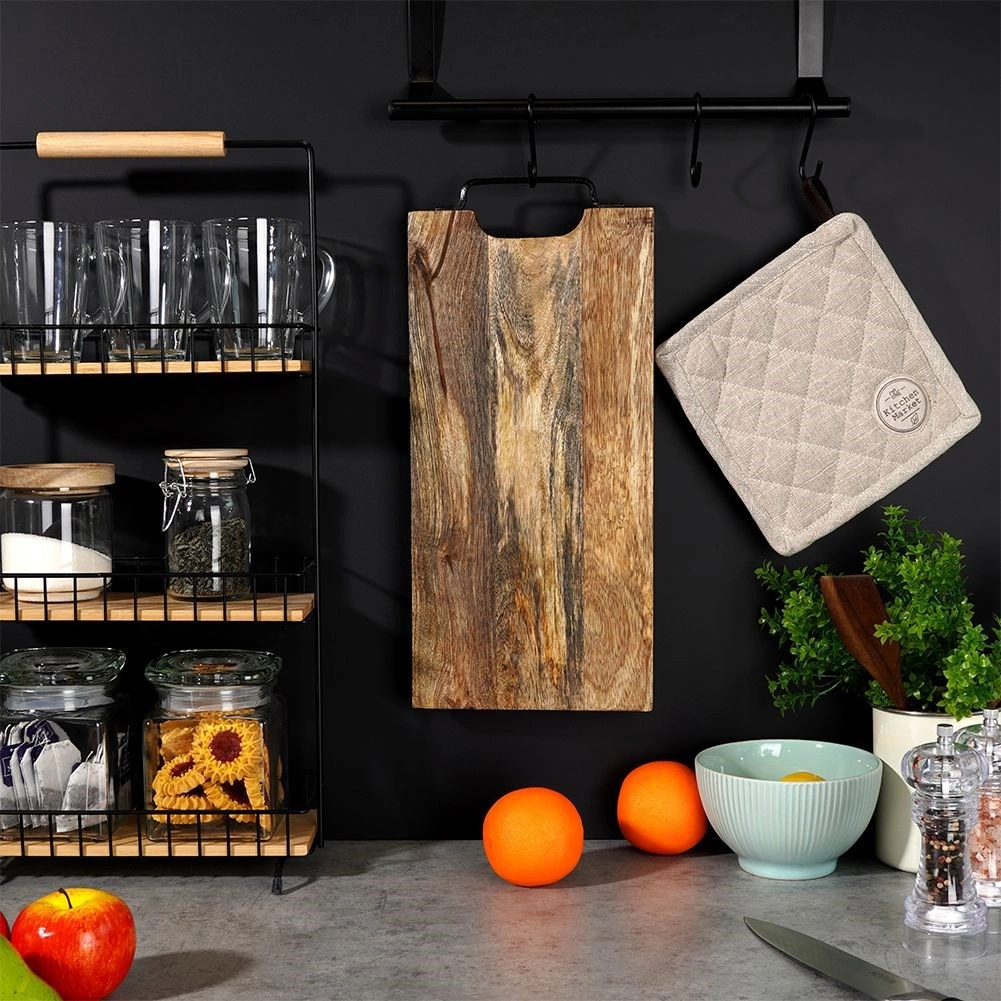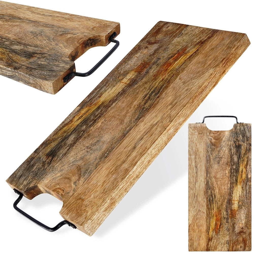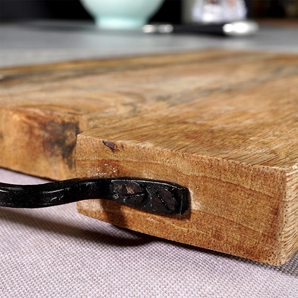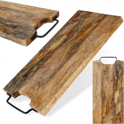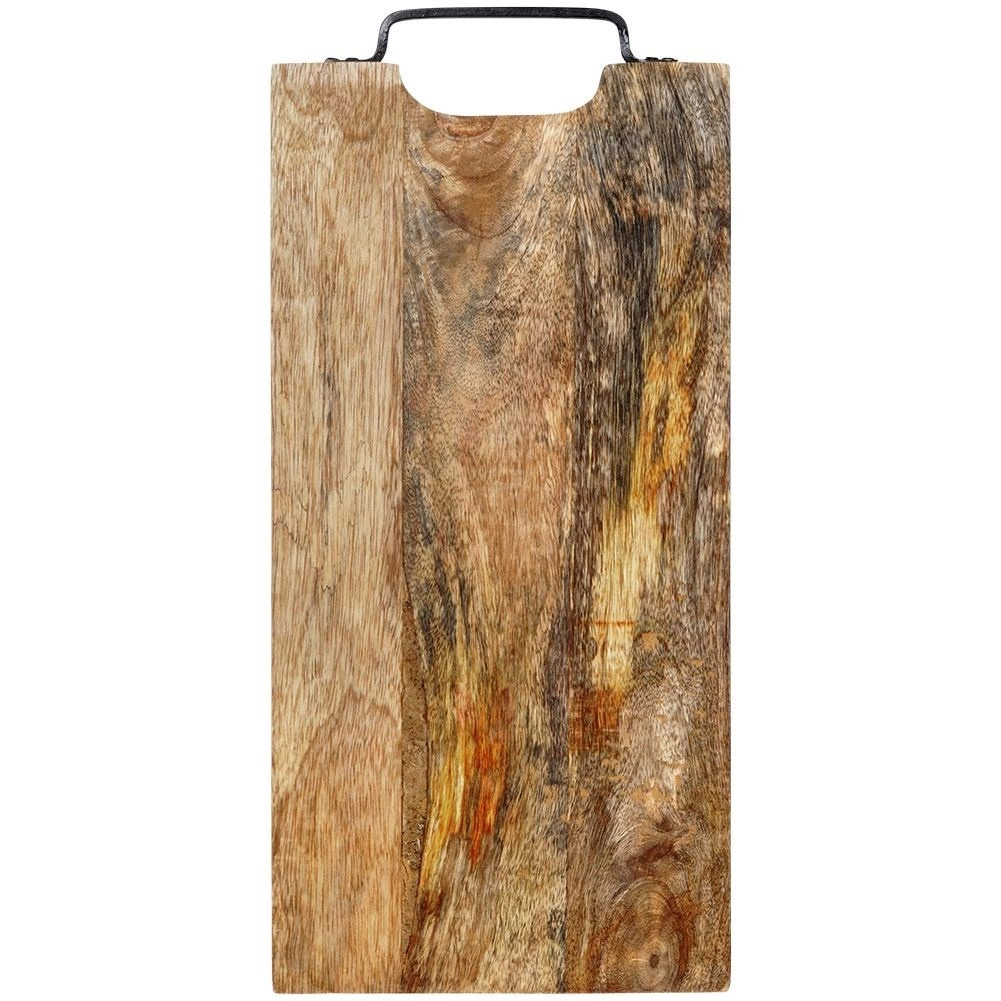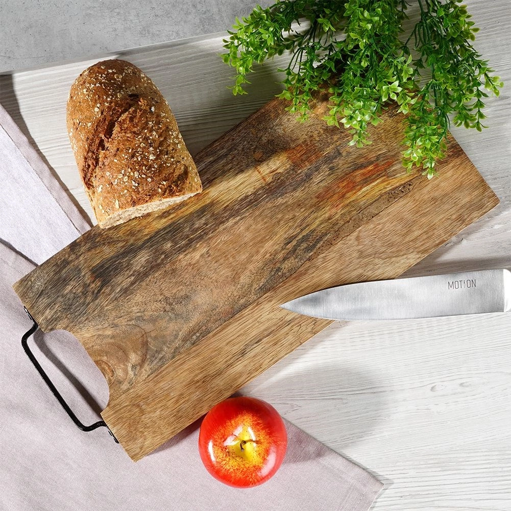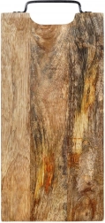 Robustní dřevěné prkénko z mangového dřeva o rozměrech 44 × 19 cm a tloušťce 2 cm je ideální na krájení i podávání. Má velkou pracovní plochu, praktické kovové madlo pro snadné přenášení či zavěšení a přirozeně odolný povrch, který nenasákává pachy a rychle schne. Stylový, lehce industriální vzhled zvýrazňuje černé kovové držadlo.