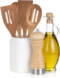 Ergonomická rukojeť částečně lakovaná do bílé barvy dobře padne do ruky a díky závěsnému otvoru lze lžíci snadno skladovat na kuchyňském relingu. Dřevo je šetrné k teflonovým, keramickým i žulovým povrchům, takže nepoškrábe nádobí. Nedoporučuje se mytí v myčce – pro delší životnost stačí ruční oplach a vysušení.