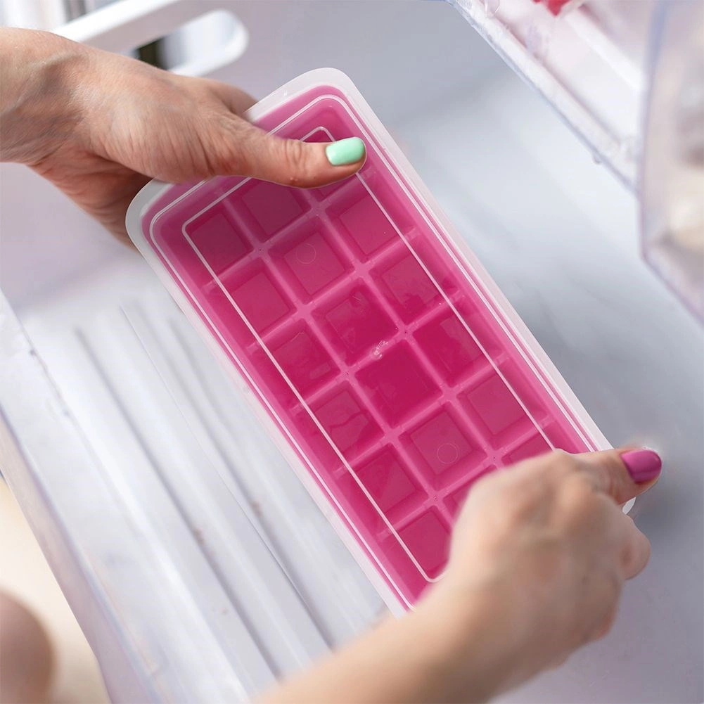 Elastické dno formy usnadňuje uvolnění až 18 kostek bez námahy. Víčko brání rozlití vody při přenášení do mrazáku.