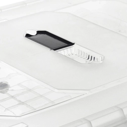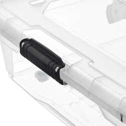 Pevné boční klipy a přesně lícující víko chrání před prachem. Průhledné stěny usnadňují rychlou identifikaci uložených věcí.