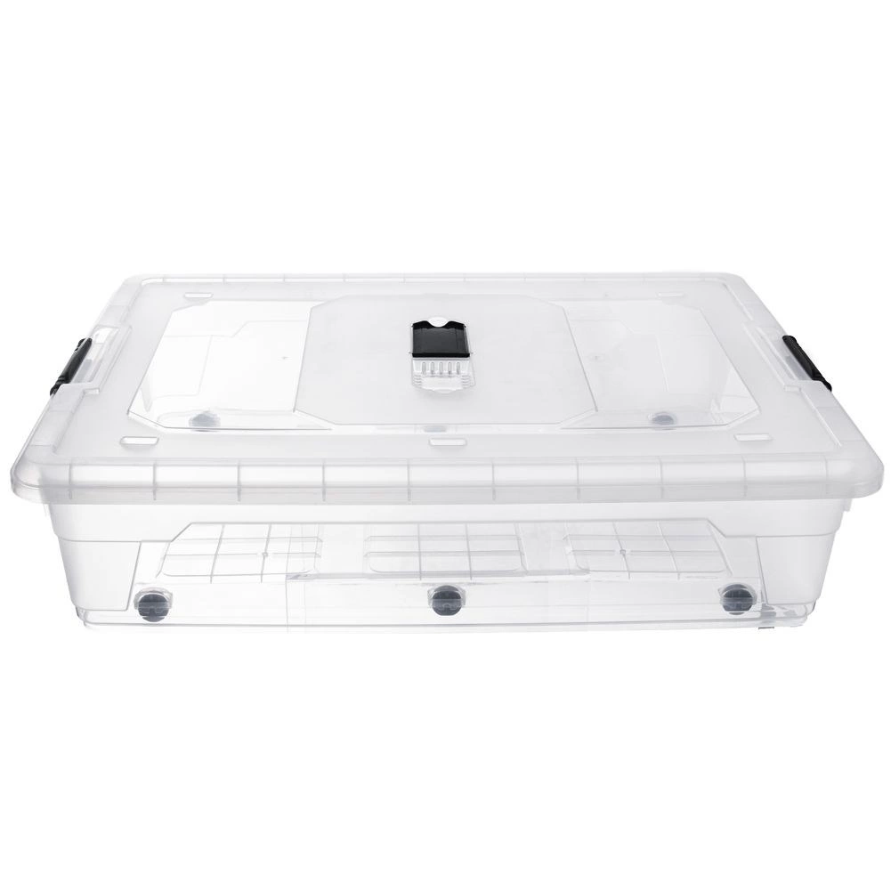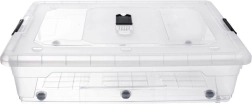 Praktický podpostelový box s objemem 50 l udrží váš domov přehledný a bez nepořádku. Díky průhlednému plastu snadno vidíte obsah, pevné klipy zajistí bezpečné uzavření a integrovaný větrací otvor pomáhá udržet věci svěží. Nízký profil s kolečky pro snadné vysouvání je ideální do malých bytů i ložnic.