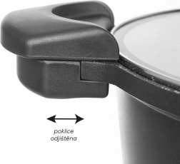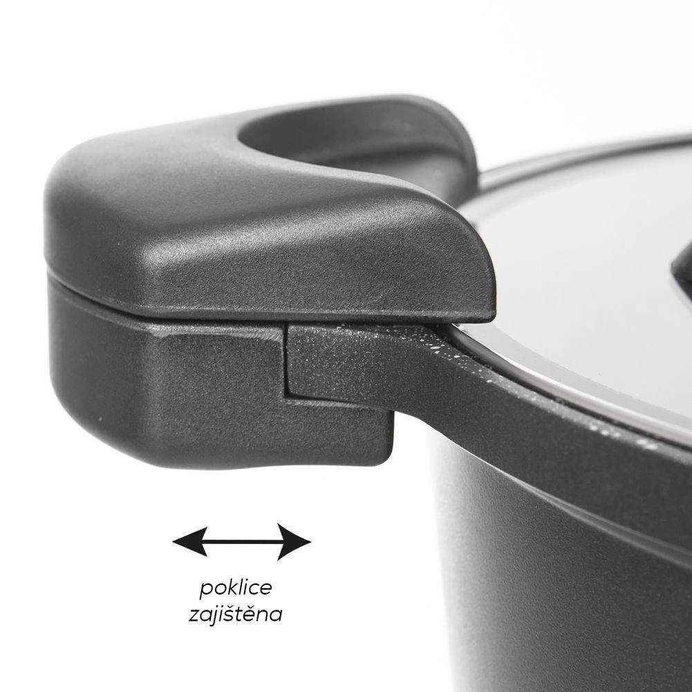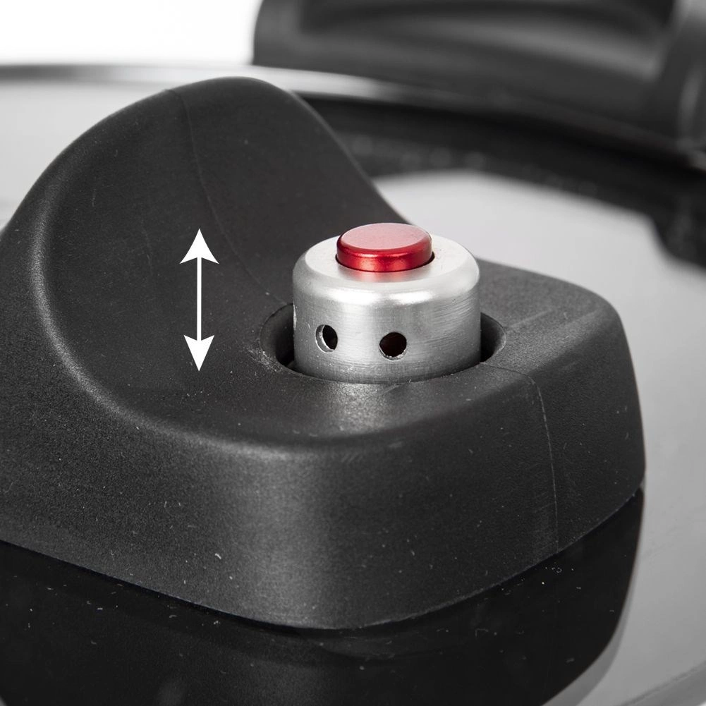 Dva bezpečnostní ventily, silikonové těsnění a posuvné úchyty spolehlivě zajišťují poklici a kontrolují tlak při vaření.