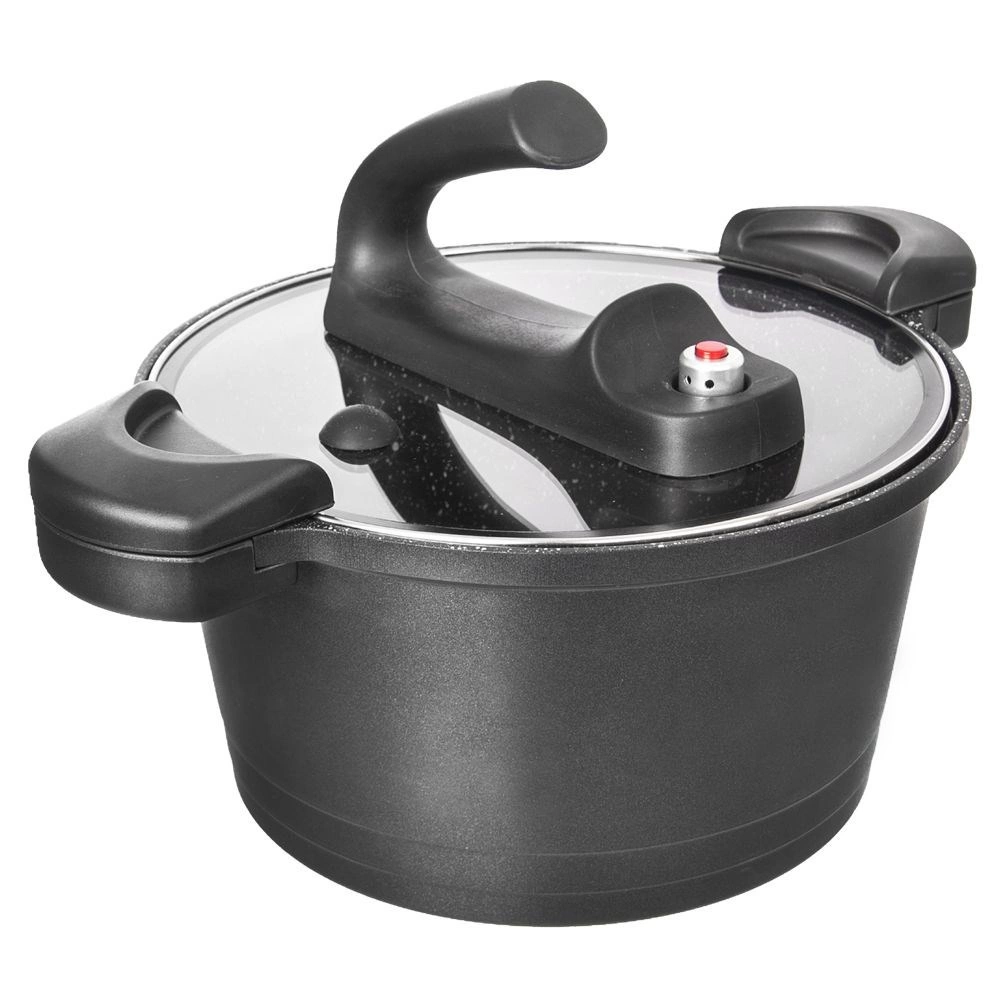 Uvařte rychleji a zdravěji s tlakových hrncem GRANDE o objemu 5,5 l a průměru 26 cm. Díky speciální szybkowarové poklici zkrátíte dobu vaření, zachováte více živin a chuti a ušetříte až 50 % energie. Odolné granitové nepřilnavé povrchování PFLUON GRANIT, rovnoměrná distribuce tepla, bezpečné uzamčení s dvojitým ventilem a kompatibilita se všemi typy sporáků včetně indukce.