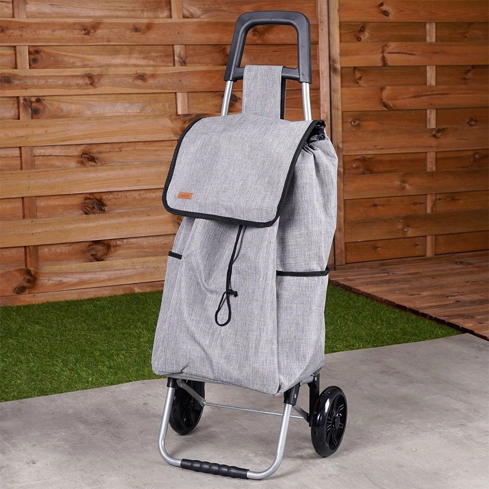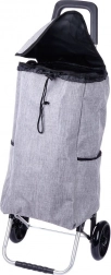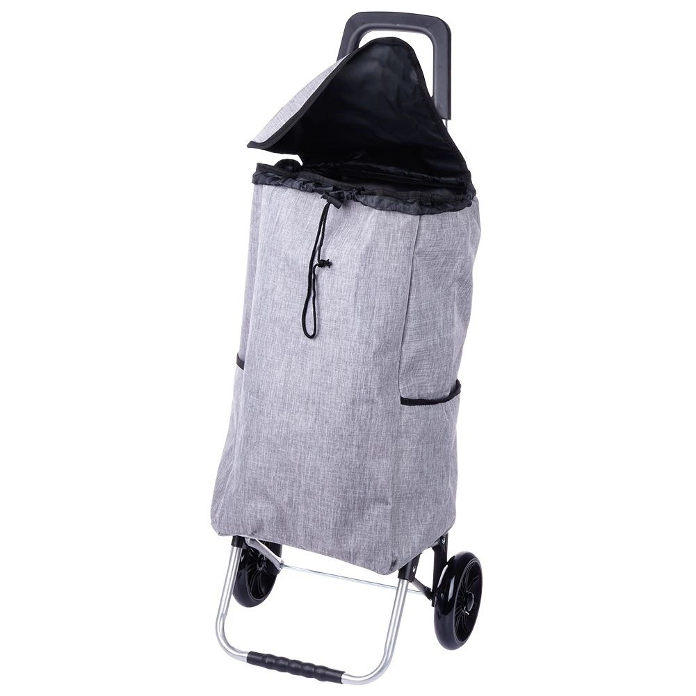Nákupní vozík se šedou textilní taškou je navržen pro pohodlné a bezpečné převážení nákupu. Lehký, přesto odolný kovový rám se dvěma velkými plastovými koly zajišťuje stabilitu a plynulý pohyb. Taška je chráněna klopou a uzavírá se na stahovací šňůrku, takže obsah zůstane v bezpečí i za horšího počasí.