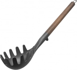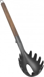 Termoplastická lžíce na těstoviny je ideální pro nabírání, odčerpávání a servírování špaget přímo z horké vody. Vyniká pevností a odolností díky kvalitnímu materiálu PBT v černé barvě, zatímco kovová rukojeť s povrchovou úpravou v dekoru dřeva dodává elegantní vzhled, který zapadne do tradiční i moderní kuchyně.