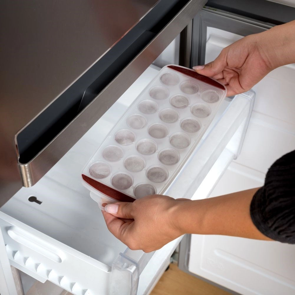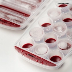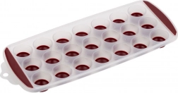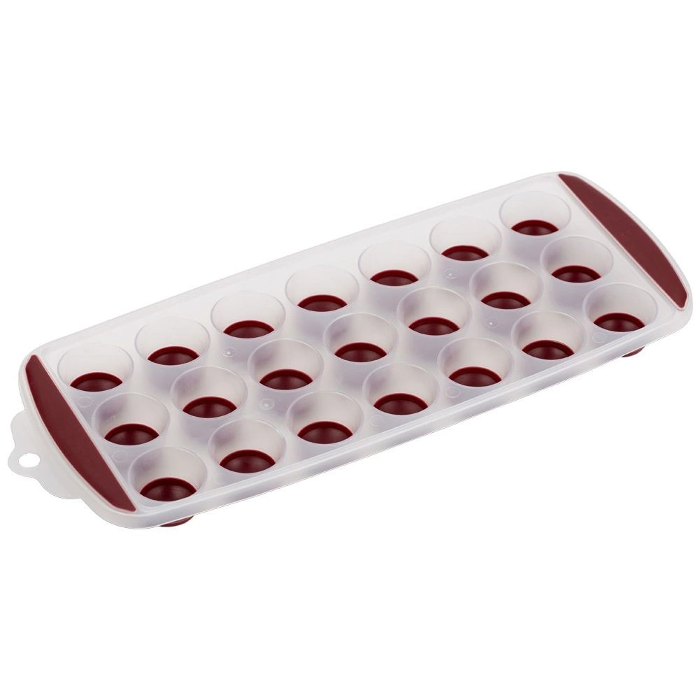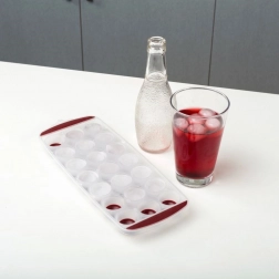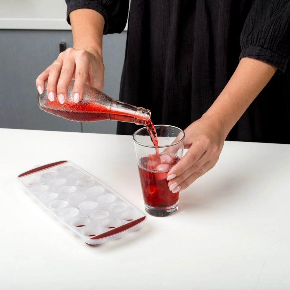 Praktická silikonová forma na led pro přípravu až 21 kulatých kostek s elastickým dnem pro snadné uvolnění. Kombinuje bezpečné materiály (plast a silikon) s protiskluzovými úchyty v bordó barvě. Ideální pro vodu, limonády i koktejly, vhodná také pro mražení šťáv a sorbetů. Snadná údržba, vhodné do myčky.