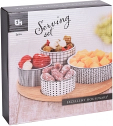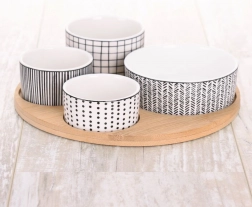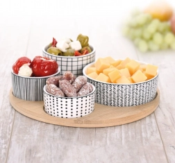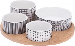 Stylová 5dílná sada pro každodenní i sváteční stolování. Čtyři porcelánové mističky v různých velikostech poskytují perfektní řešení pro servírování oříšků, antipasti, oliv, dipů či omáček. Kulatý bambusový tác s vyhrazenými místy pro každou misku zajišťuje bezpečné a pohodlné přenášení bez posouvání.