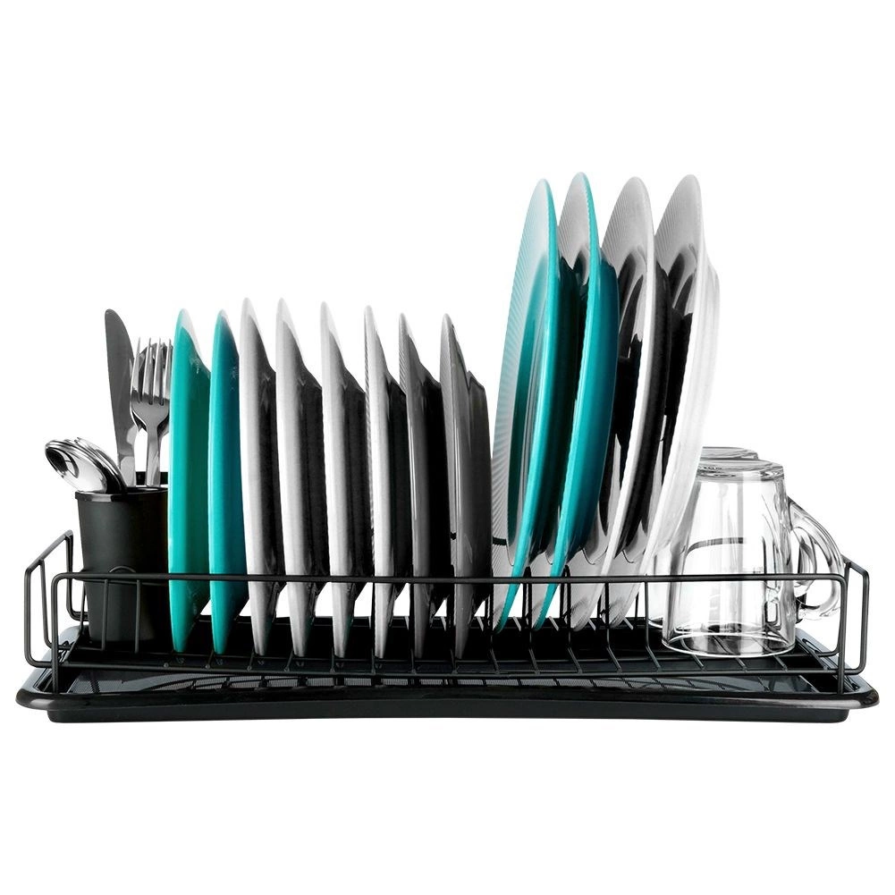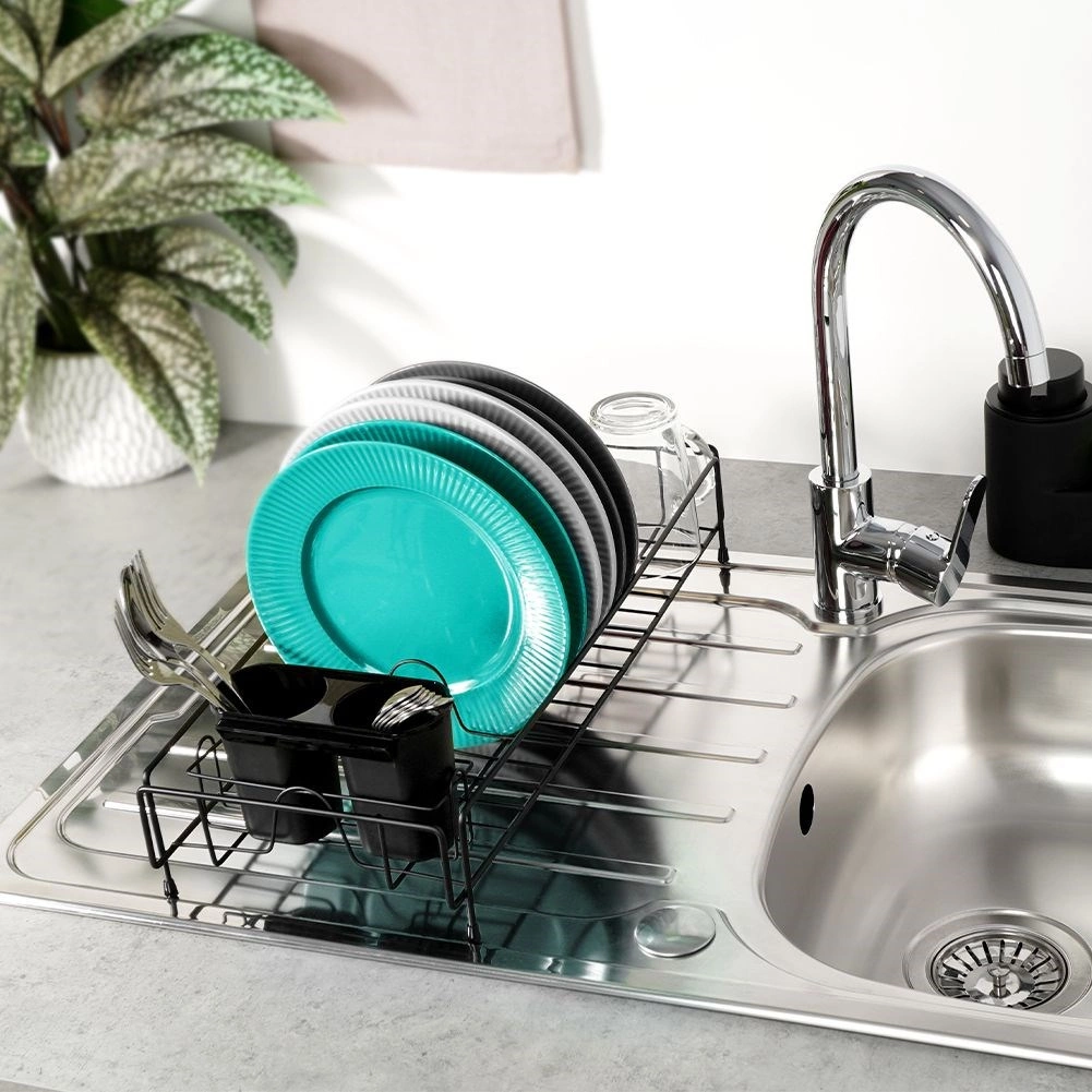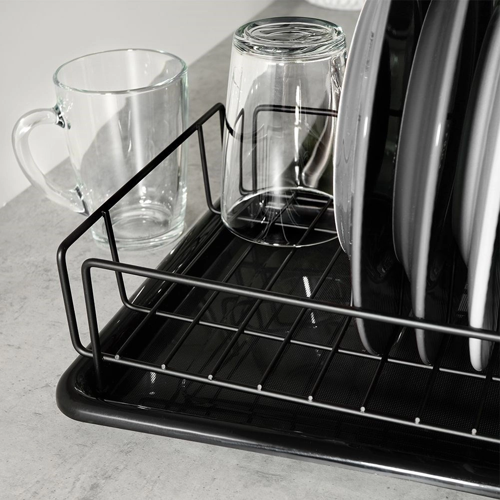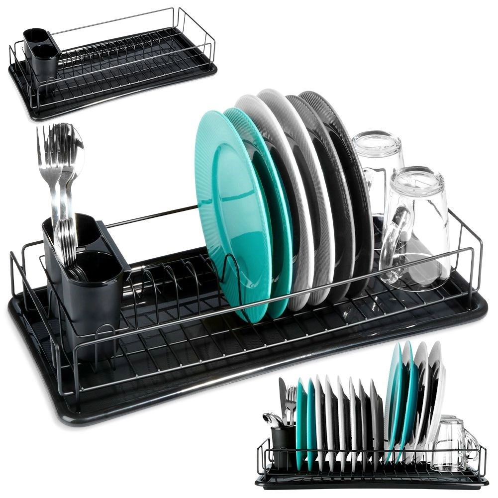 Elegantní a kompaktní odkapávač na nádobí v černé barvě je praktickým doplňkem každé kuchyně. Díky pevnému kovovému rámu a vyjímatelné plastové odkapávací misce udrží vaši pracovní plochu čistou a suchou. Důmyslné rozvržení s držáky na talíře a prostorem pro hrnky zajišťuje rychlé a hygienické sušení.