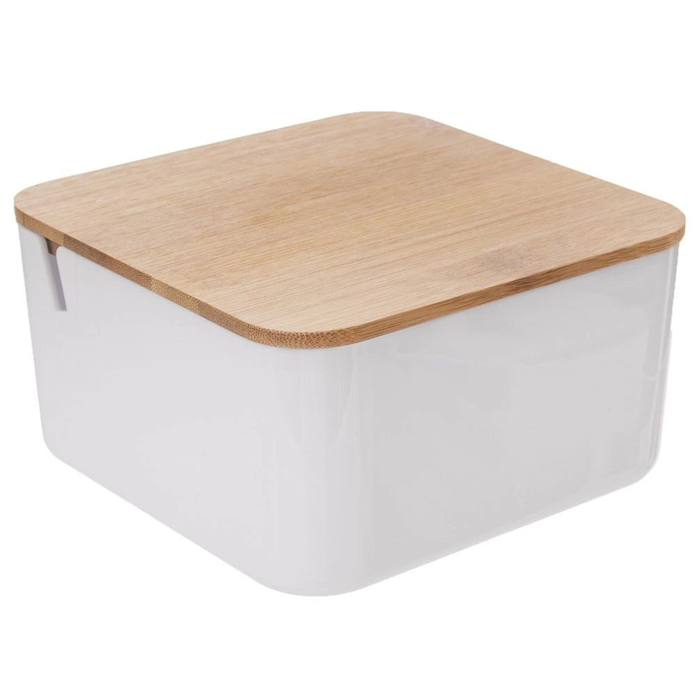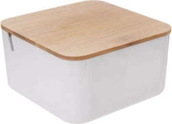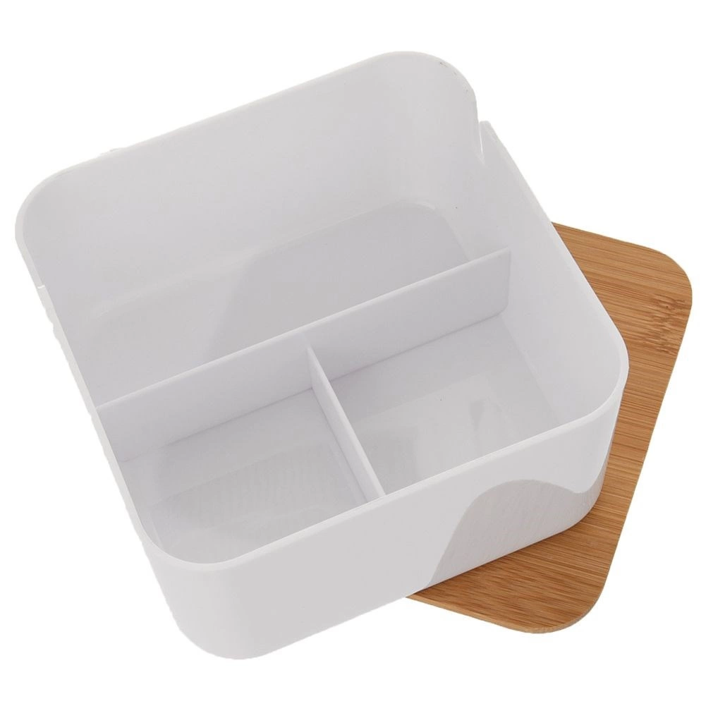 Elegantní a funkční řešení pro každodenní péči: kosmetické zrcátko s organizérem, které šetří místo a udržuje vše potřebné po ruce. Kombinace bílého plastu a bambusového dřeva působí moderně a hodí se do každého interiéru.