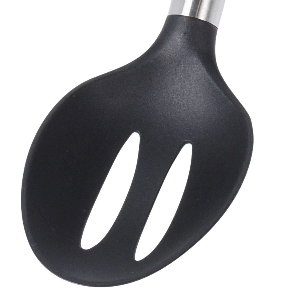 Tato kuchyňská lžíce s otvory je ideální pro každodenní vaření. Nylonová pracovní část je pevná, odolná proti opotřebení a bezpečná pro pánve s nepřilnavým povrchem – nepoškrábe teflon, keramiku ani sklo. Díky tepelně odolnému materiálu do 210 °C bez obav promícháte i horké pokrmy.