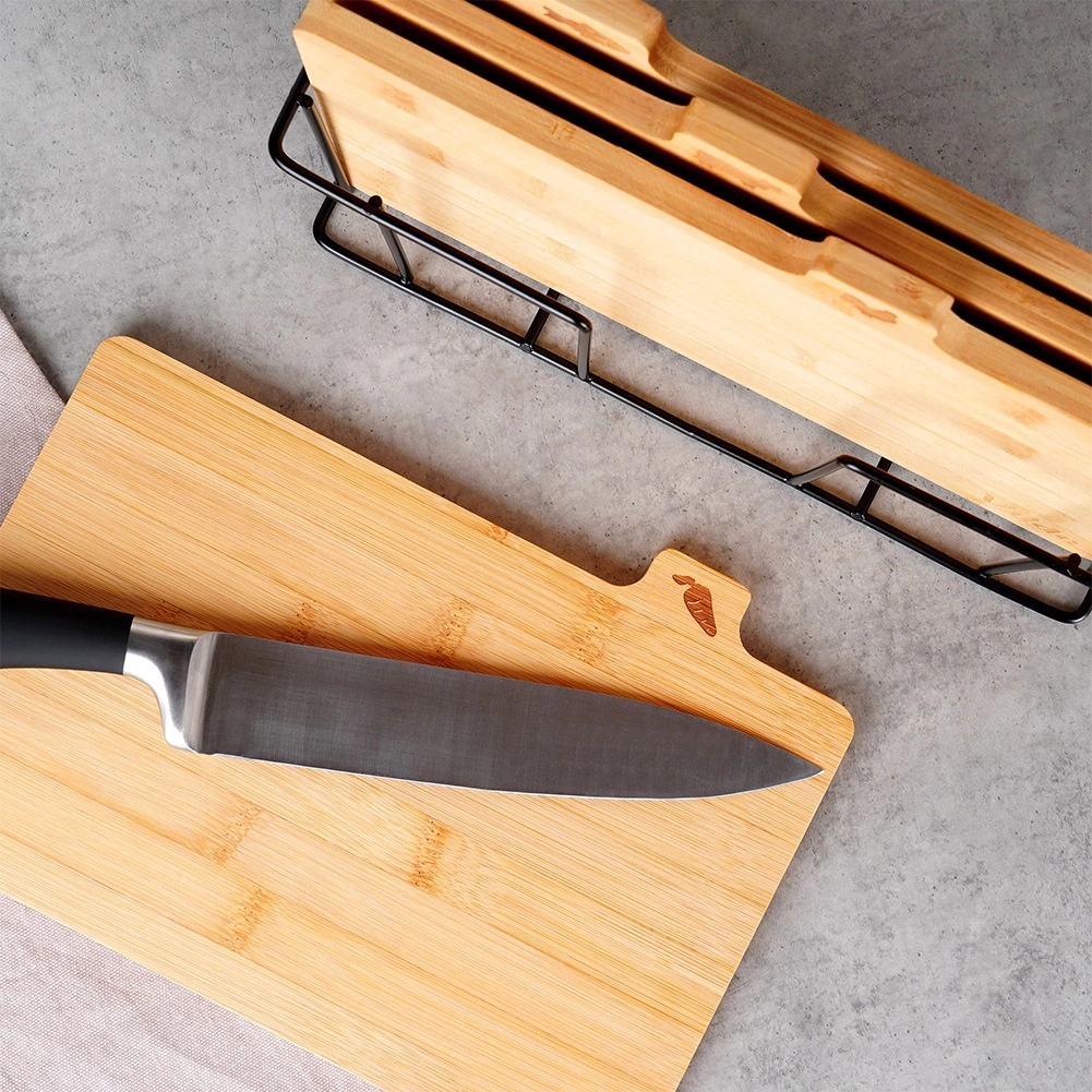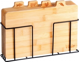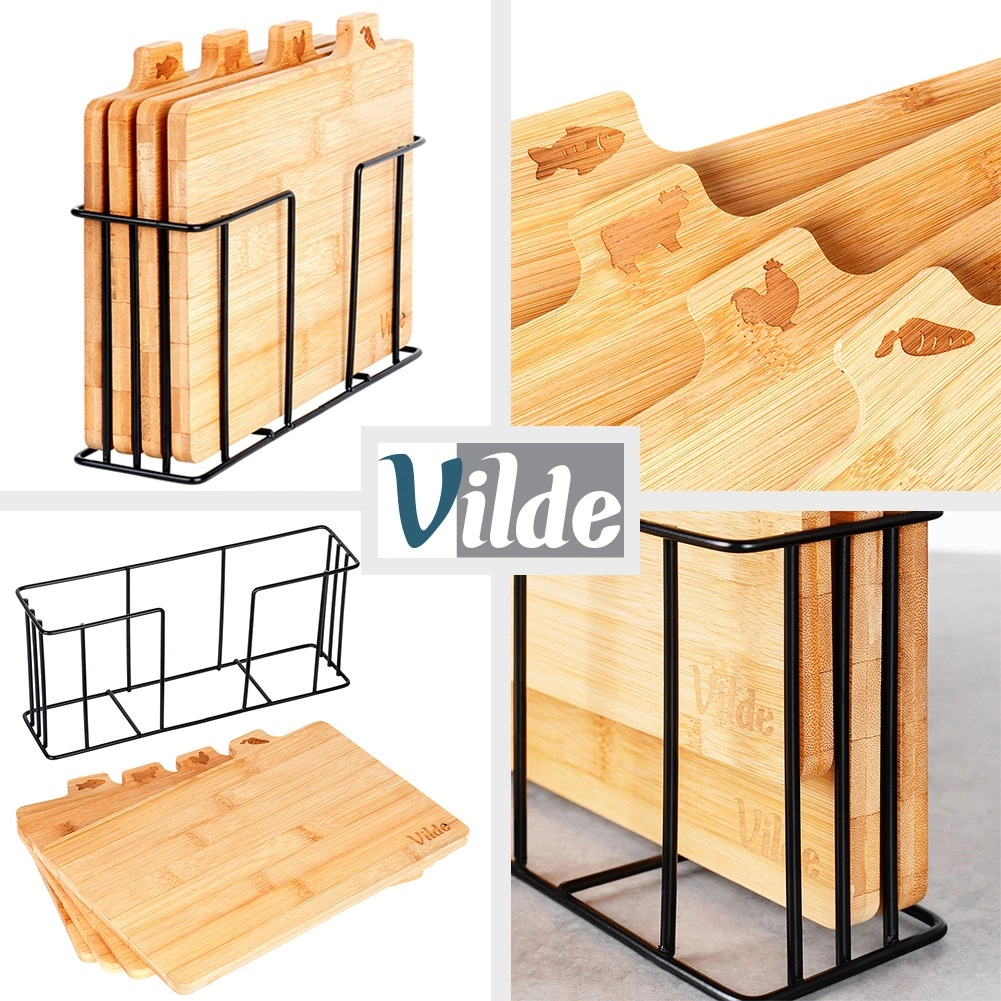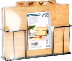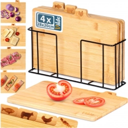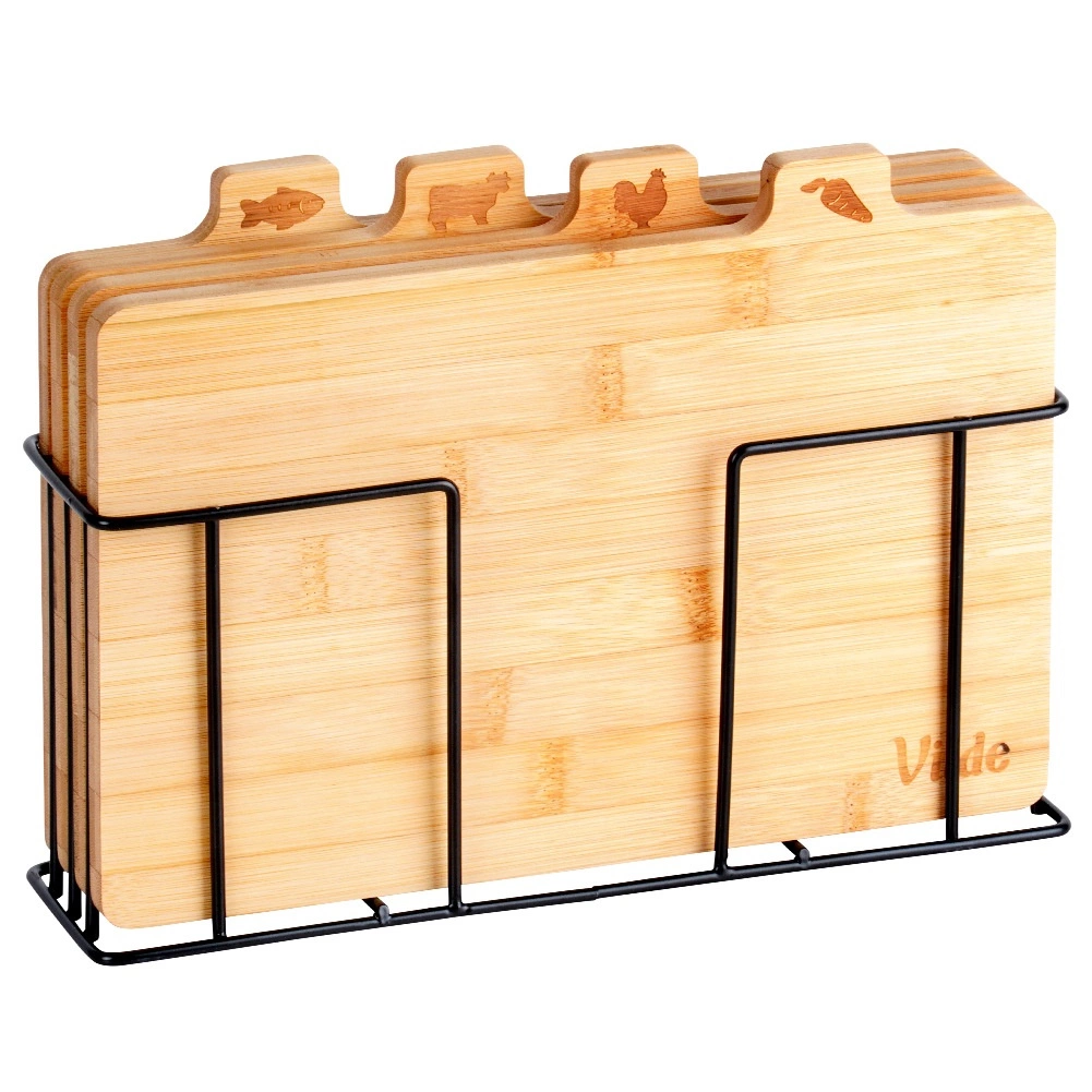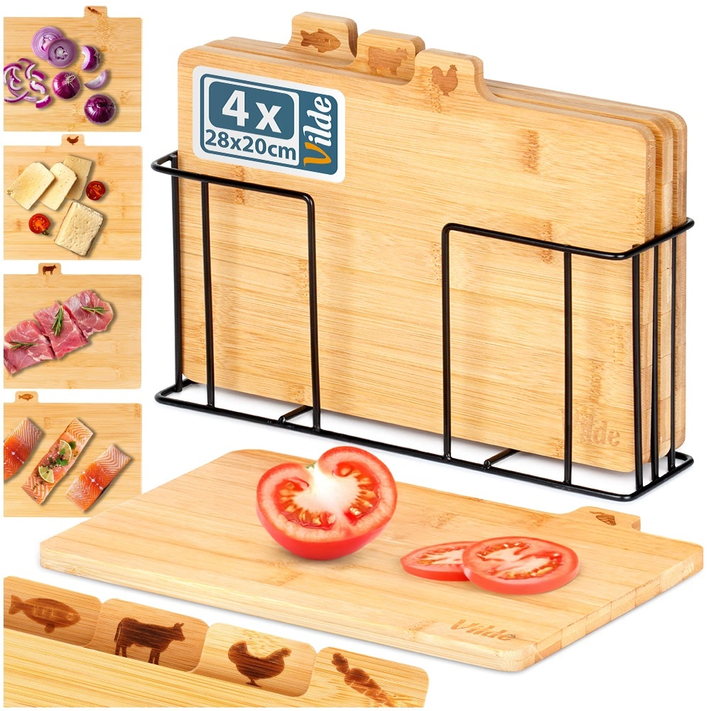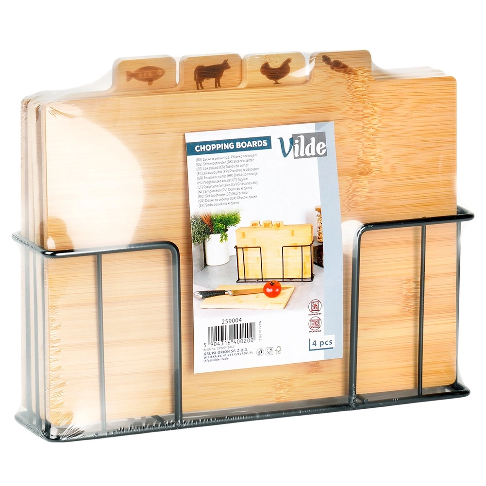 S touto sadou bambusových prkének udržíte kuchyň v dokonalém pořádku. Čtyři samostatná prkénka s praktickými záložkami a ikonami jasně určí, na co je použít – pro zeleninu, drůbež, maso a ryby – a tím podpoříte hygienickou přípravu jídel. Stabilní kovový stojan v černé barvě zajistí, že budou prkénka vždy po ruce a úhledně uložená.