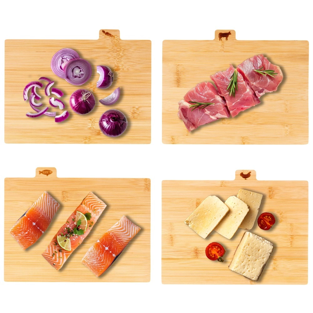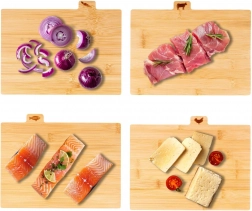 Každé prkénko má záložku s vygravírovanou ikonou pro konkrétní typ potravin – zeleninu, drůbež, maso a ryby. Snadno tak předejdete křížové kontaminaci a udržíte čistotu při vaření.