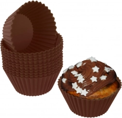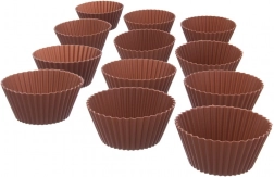 Praktická sada 12 ks silikonových formiček na muffiny v hnědé barvě. Jsou odolné vůči teplotám -40 až +220 °C, nepřilnavé, vícekrát použitelné a vhodné do trouby, mikrovlnky, mrazáku i myčky. Díky vroubkovanému okraji dodají zákuskům elegantní tvar a zajistí rovnoměrné propečení bez potírání tukem či podsypávání moukou.