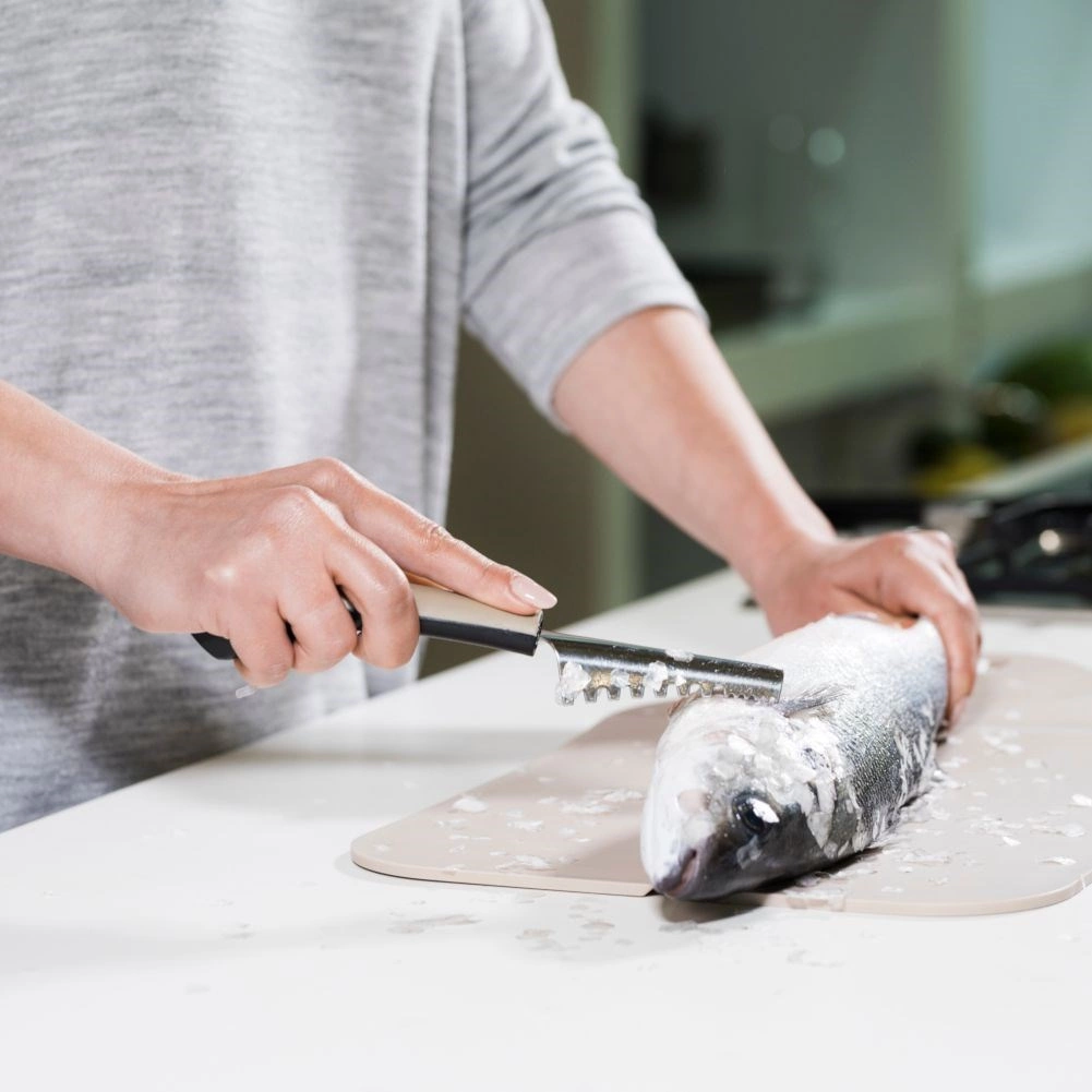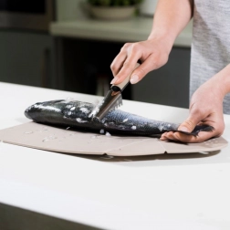 Zoubkovaná nerezová čepel rychle a šetrně odstraňuje šupiny bez poškození kůže ryby.