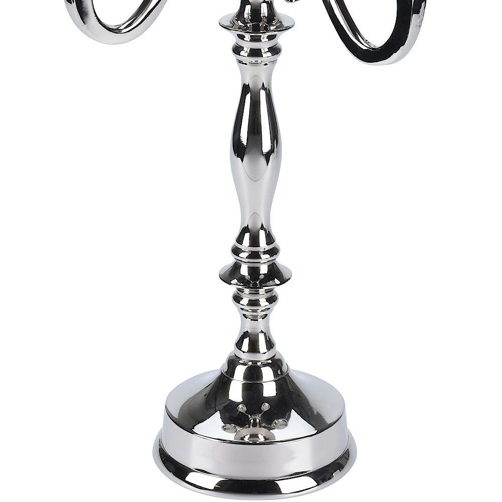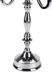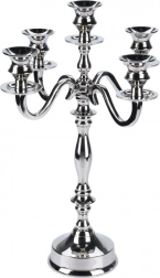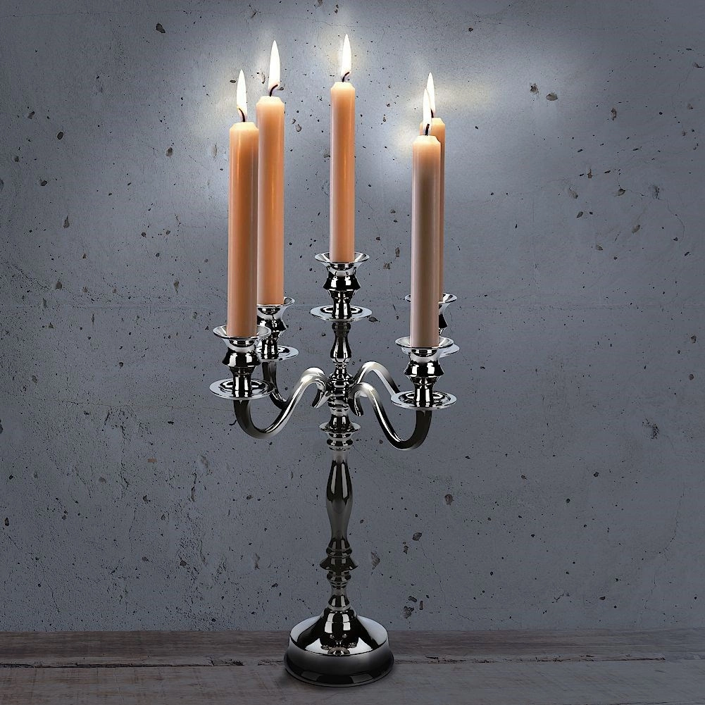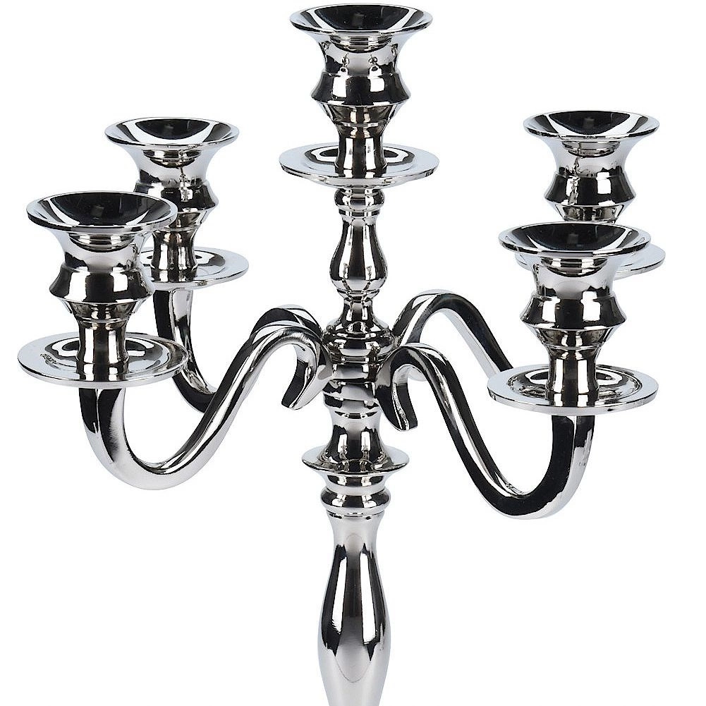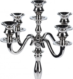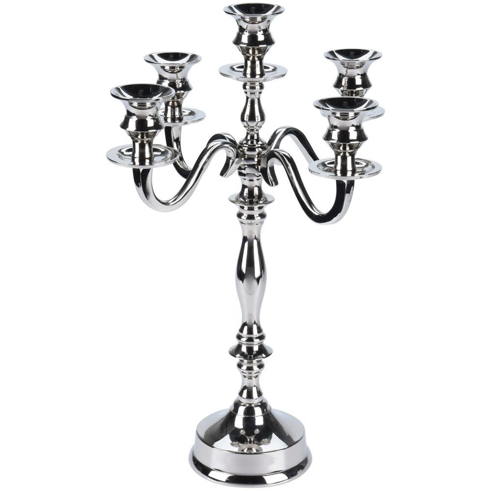 Tento pětiramenný kandelábr v nadčasovém designu je vyroben z odolného kovu s vysoce leštěnou stříbrnou povrchovou úpravou. Vynikne jako středový prvek na jídelním stole, komodě či krbové římse a promění každý večer v stylovou, romantickou atmosféru.
