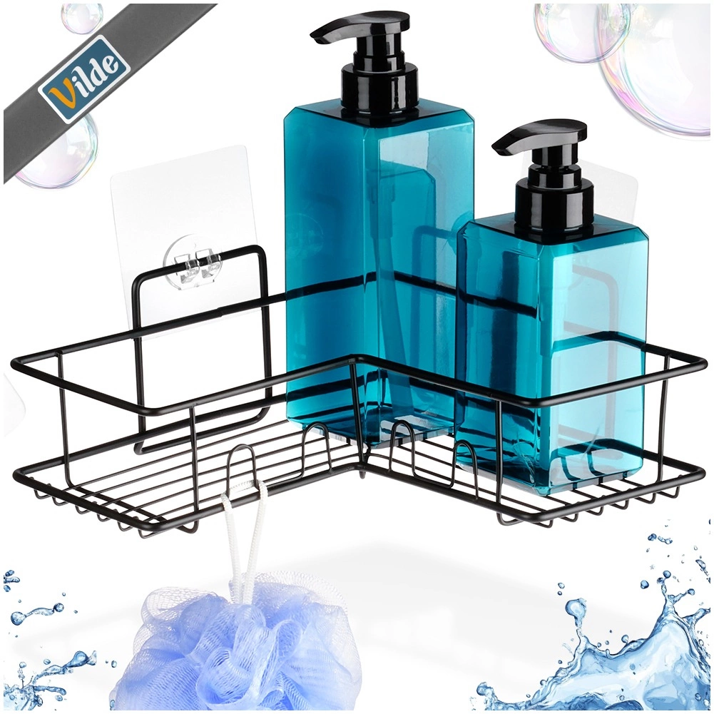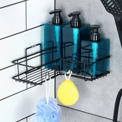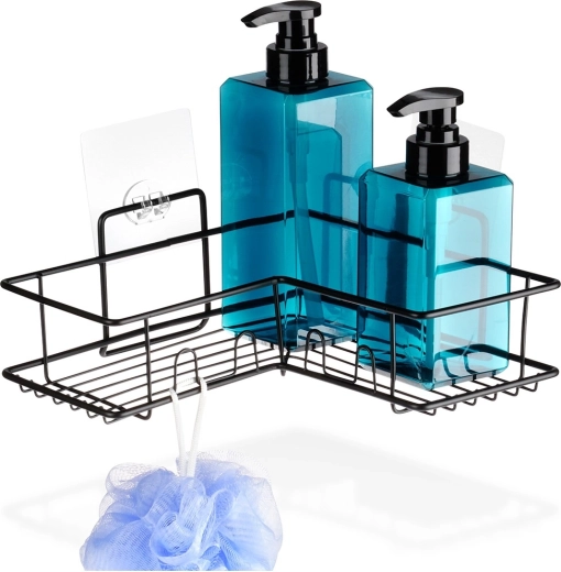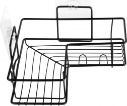Praktická rohová polička do sprchy a koupelny z odolného, práškově lakovaného kovu v černé barvě pro přehledné uložení kosmetiky a doplňků. Nabízí bezvrtací montáž pomocí samolepicích podložek, rezivzdorné provedení a otevřenou drátěnou konstrukci pro rychlý odtok vody. Ideální také do kuchyně na koření a drobnosti.