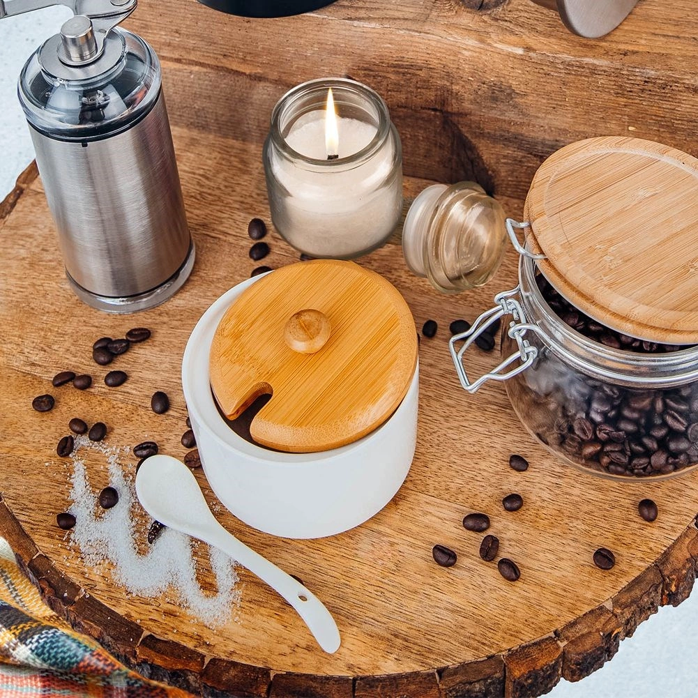 - Kvalitní materiály – porcelán v bílé barvě, bambusové víčko, porcelánová lžička.