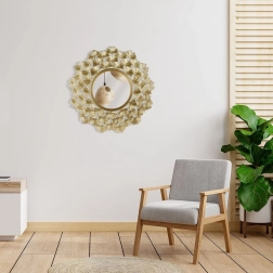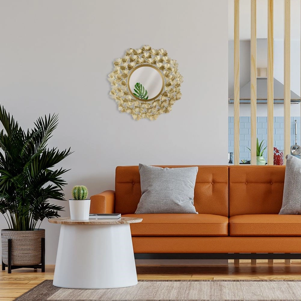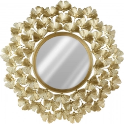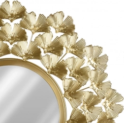 Toto dekorativní nástěnné zrcadlo vyniká okrouhlým tvarem a efektní kovovou rámovou konstrukcí ve zlaté barvě. Rám tvoří prvky inspirované listy ginkgo, které dodávají zrcadlu jedinečný a luxusní vzhled. Díky svému designu snadno opticky prosvětlí a zvětší každý prostor.