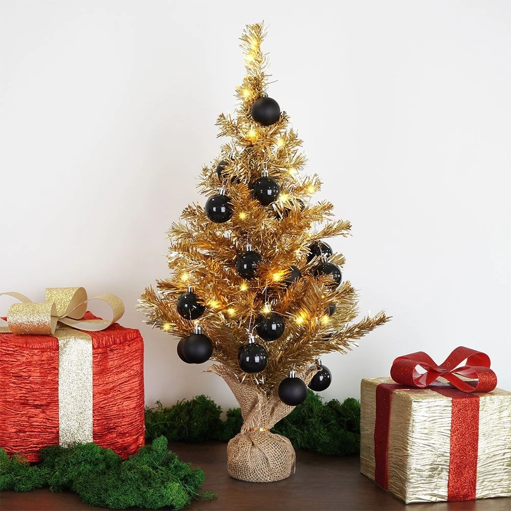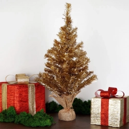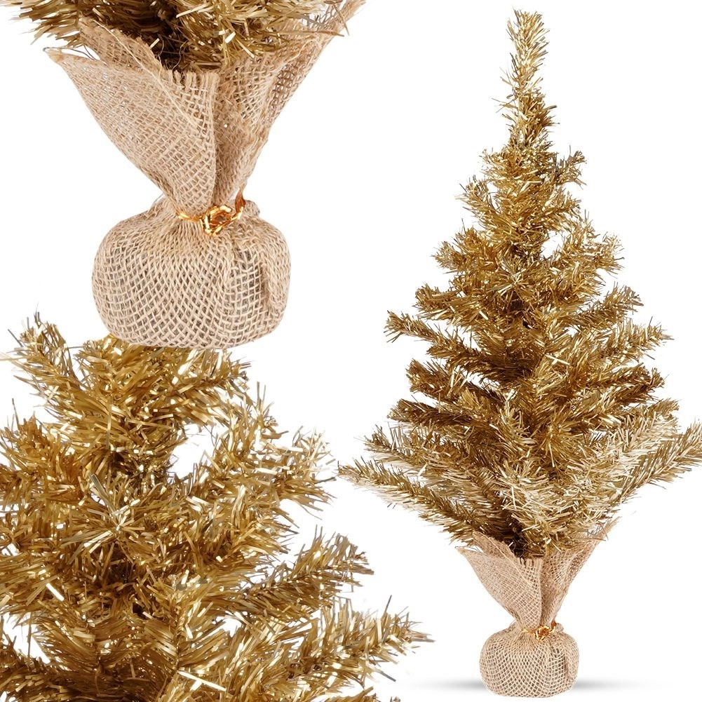 Tento kompaktní umělý vánoční stromek v luxusní zlaté barvě se skvěle hodí do bytu, kanceláře i menších prostor. Díky pevnému kovovému jádru a stabilní betonové základně v jutovém obalu bezpečně stojí a snadno se umisťuje na stůl, polici nebo parapet.