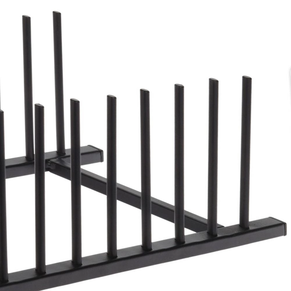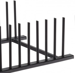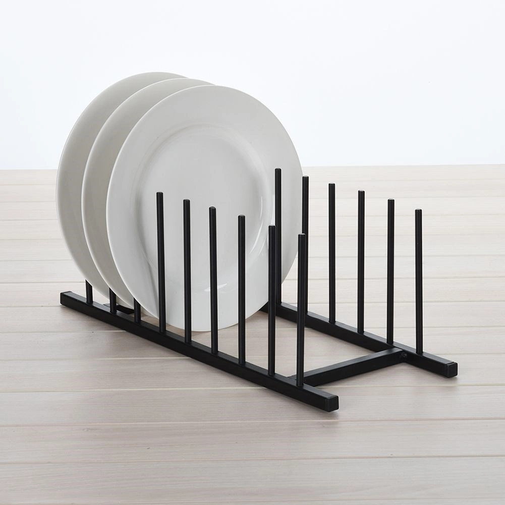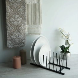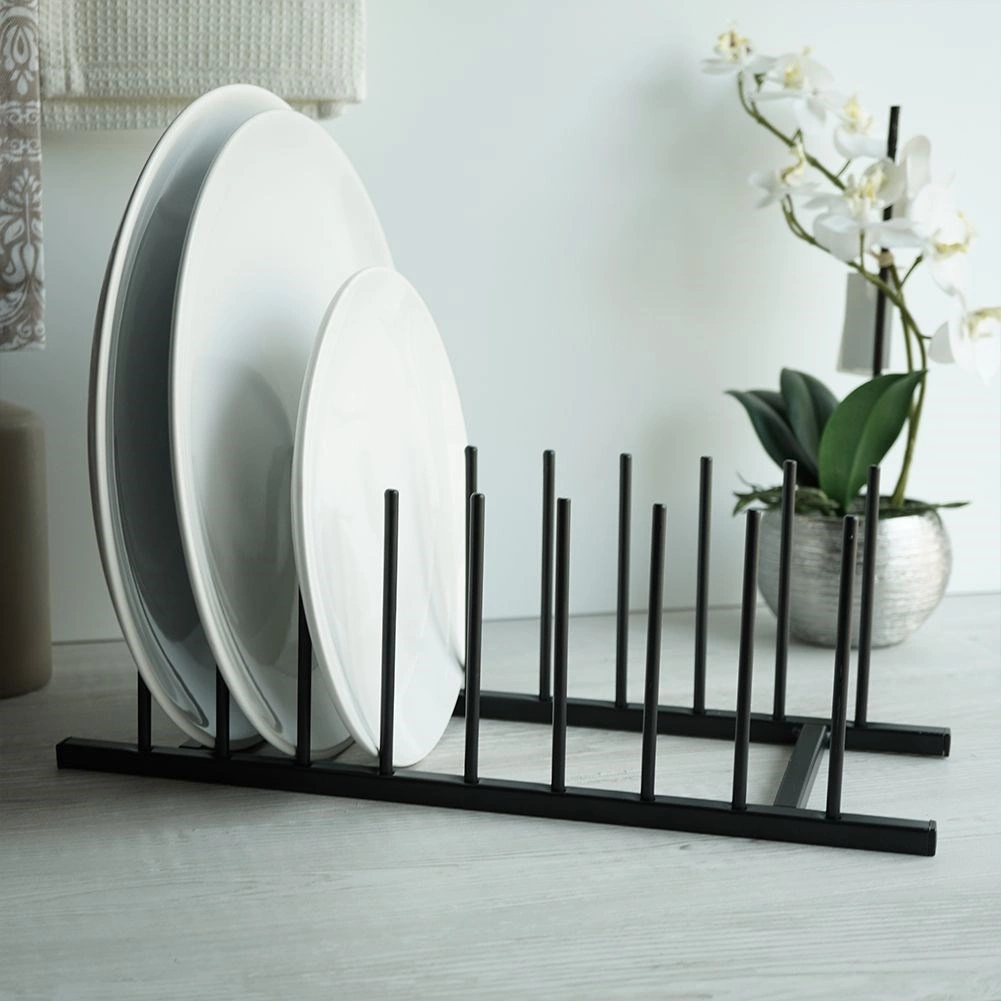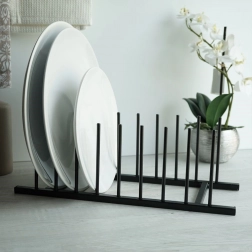Praktický kuchyňský organizér pro přehledné uložení až 8 talířů nebo pokliček v přímé vertikální poloze. Odolná kovová konstrukce v černé barvě zapadá do moderního industriálního stylu a pomáhá šetřit místo v zásuvkách i skříňkách, chrání nádobí před poškrábáním a usnadňuje sušení i organizaci.