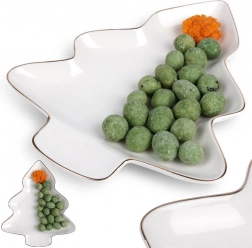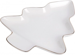 Elegantní porcelánový talíř ve tvaru stromku o rozměrech 20 × 16,5 × 2 cm dodá vašemu stolu sváteční kouzlo. V bílé barvě se zlatým lemem působí stylově a efektně, je pevný a odolný, vhodný na cukroví, pochutiny i dezerty a můžete jej mýt v myčce.