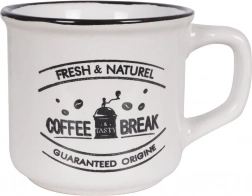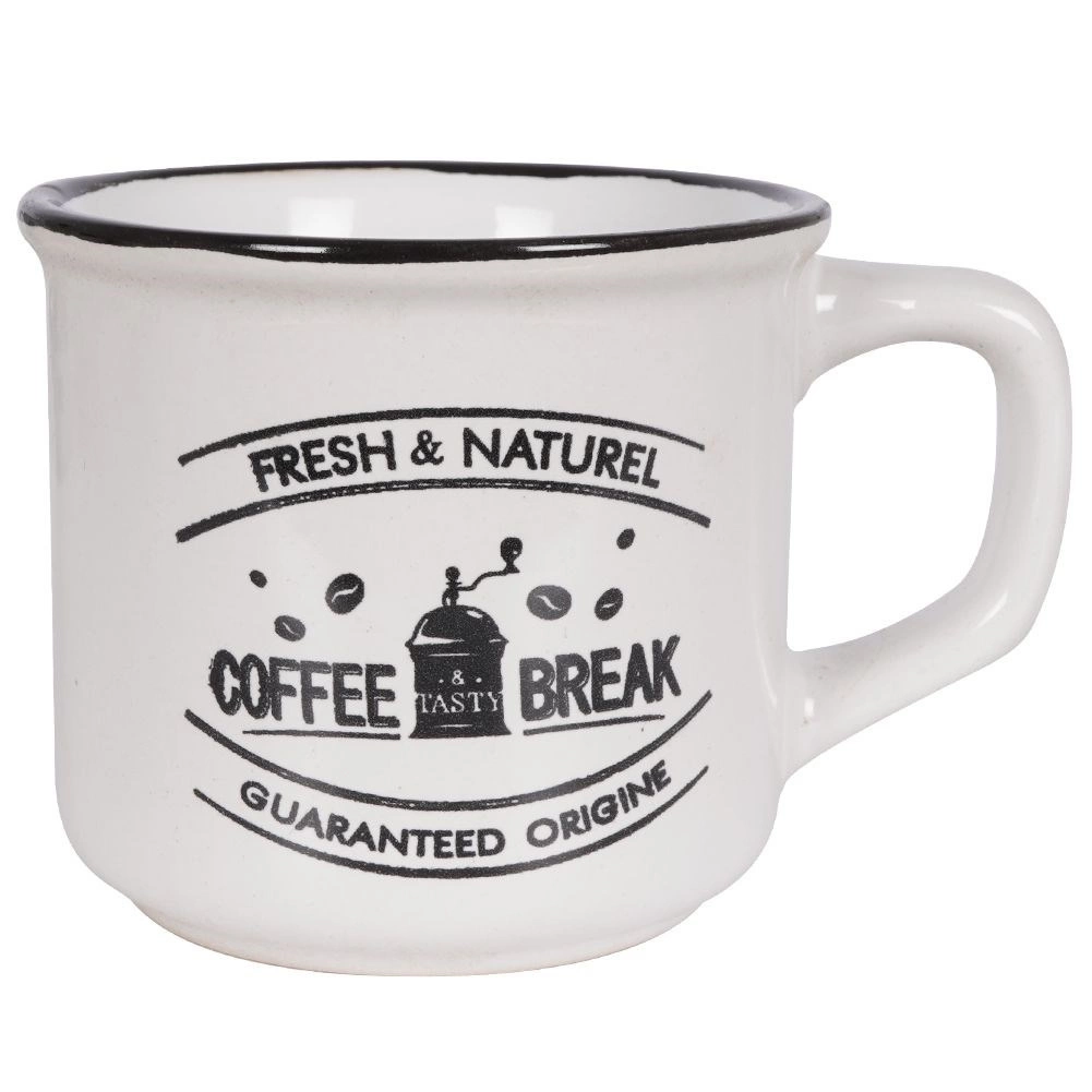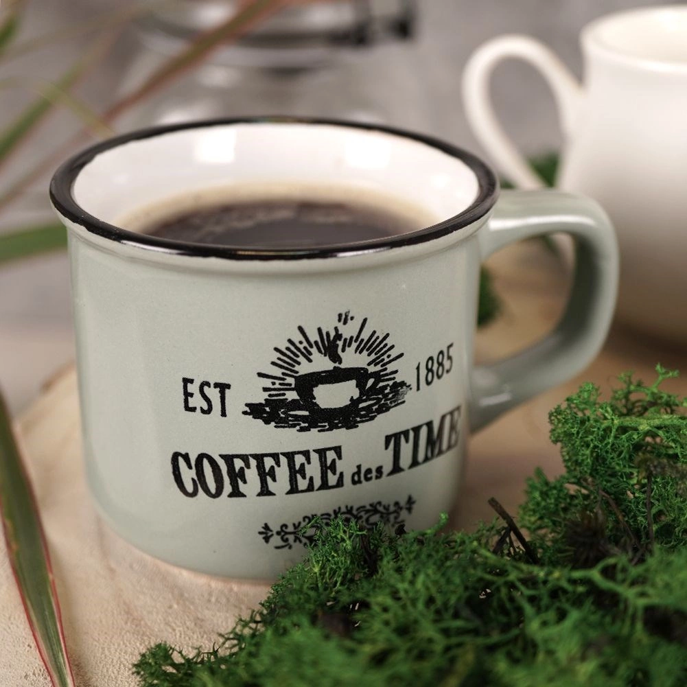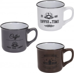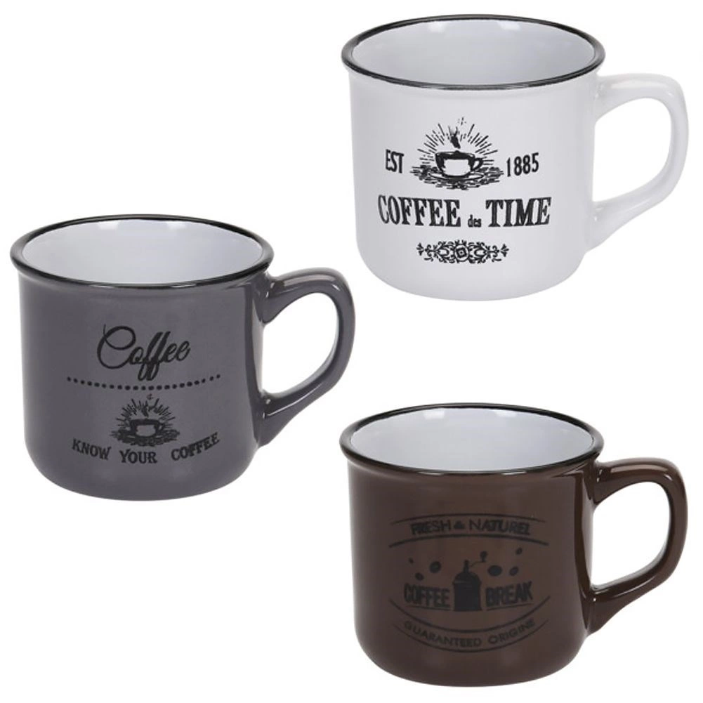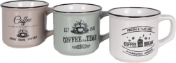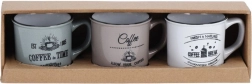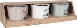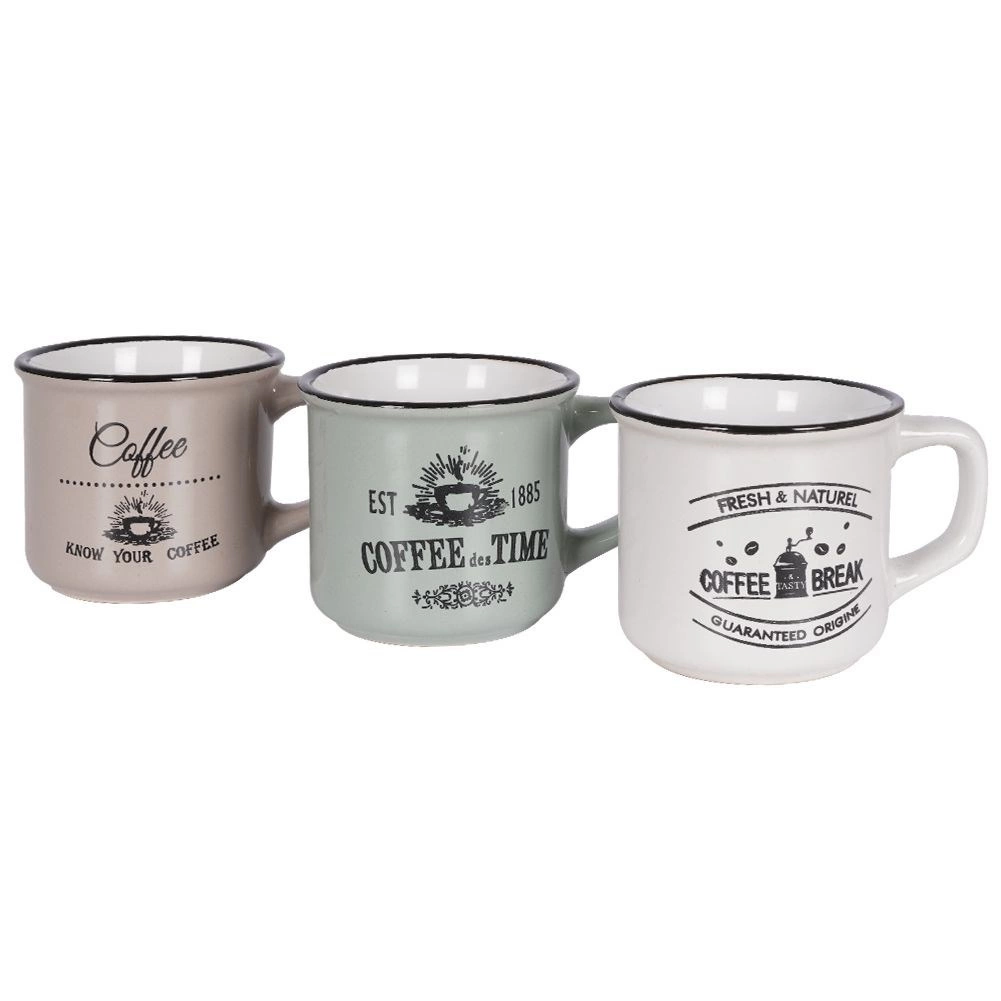 Stylová sada tří keramických hrnků o objemu 160 ml pro každodenní kávu, čaj či kakao. Nabízí kvalitní keramiku, pohodlné ucho, možnost mytí v myčce i ohřev v mikrovlnce. Díky vintage kávovým potiskům a černému lemu skvěle doplní moderní i rustikální stolování.