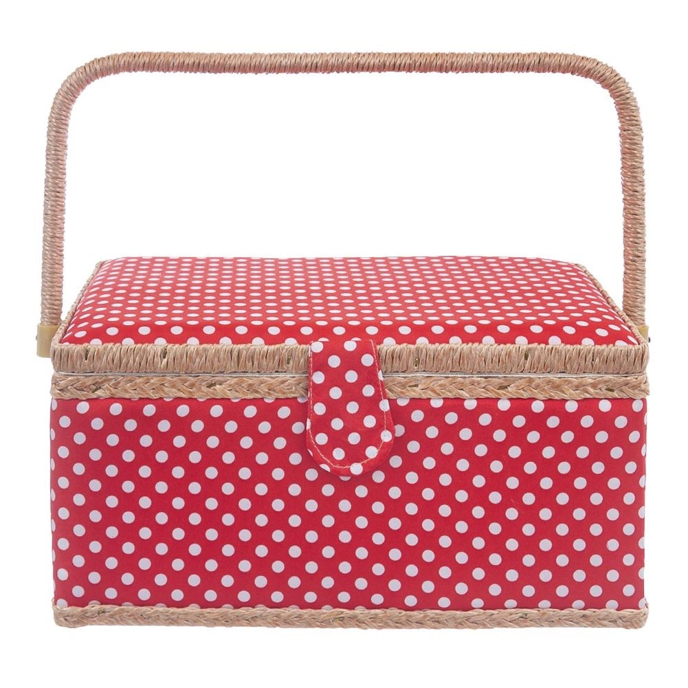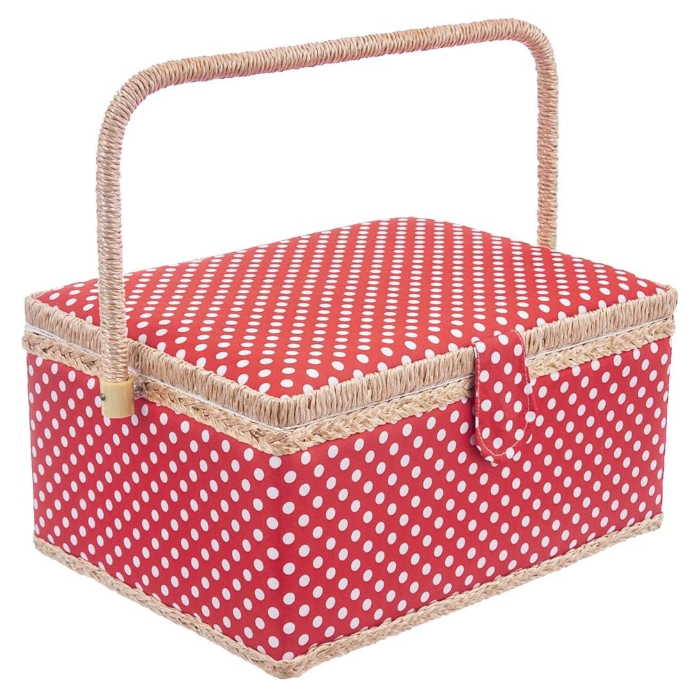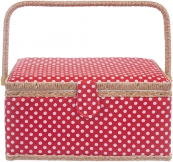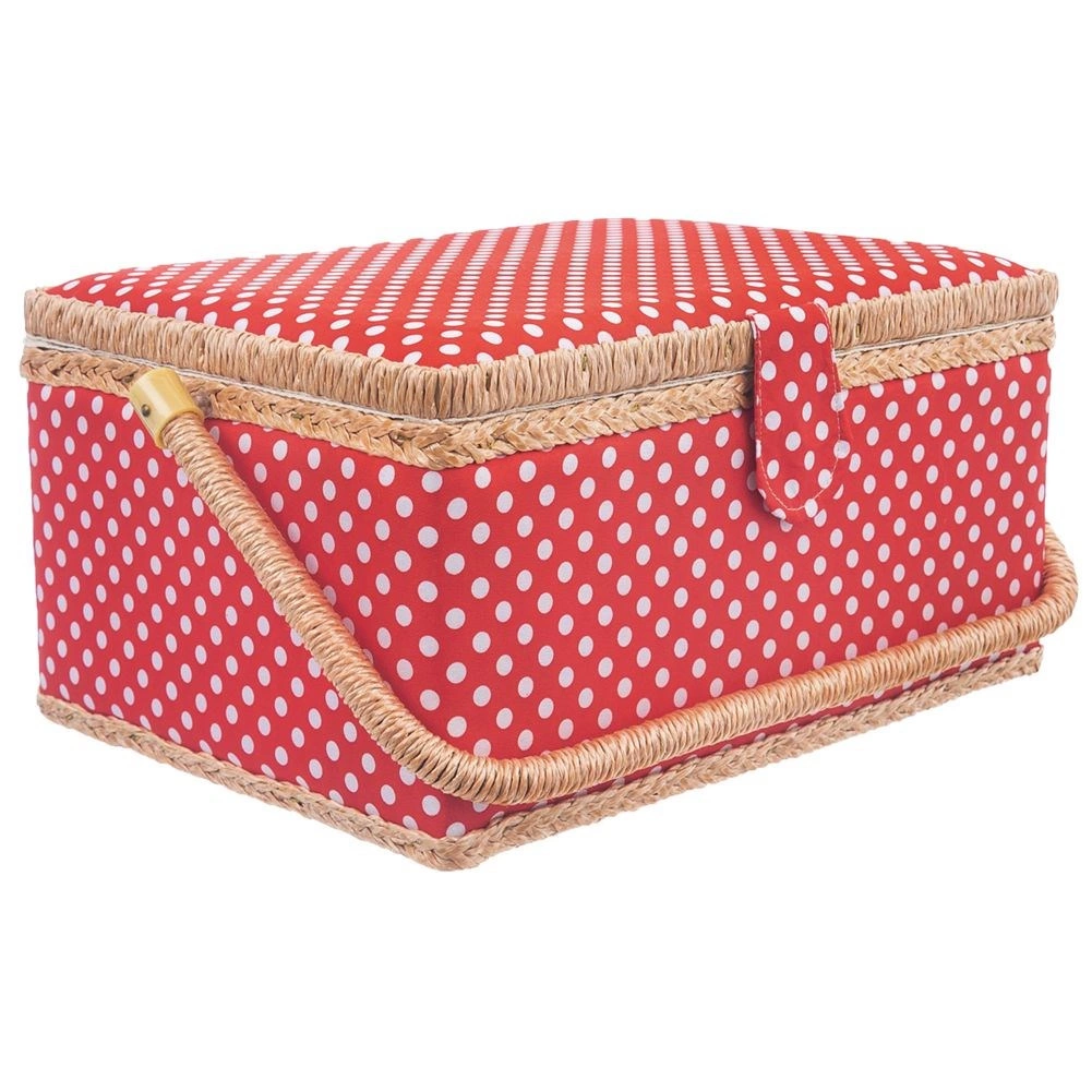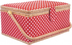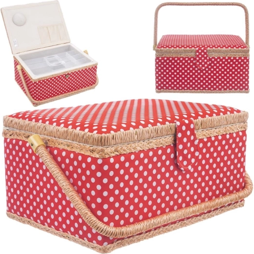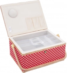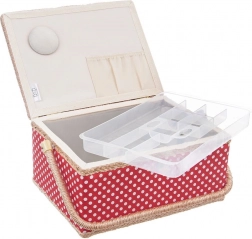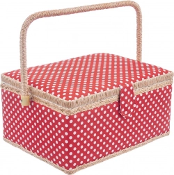 Tento šicí košík kombinuje atraktivní design a promyšlenou organizaci. Tělo košíku je potaženo látkou v červené barvě s bílými puntíky a doplněno pevným uchem pro snadné přenášení. Díky magnetickému zapínání košík bezpečně uzavřete jedním pohybem a obsah zůstane na svém místě i při přenášení.