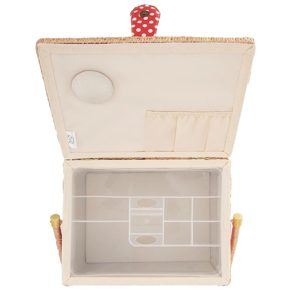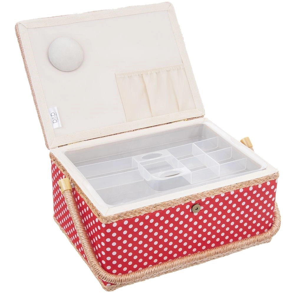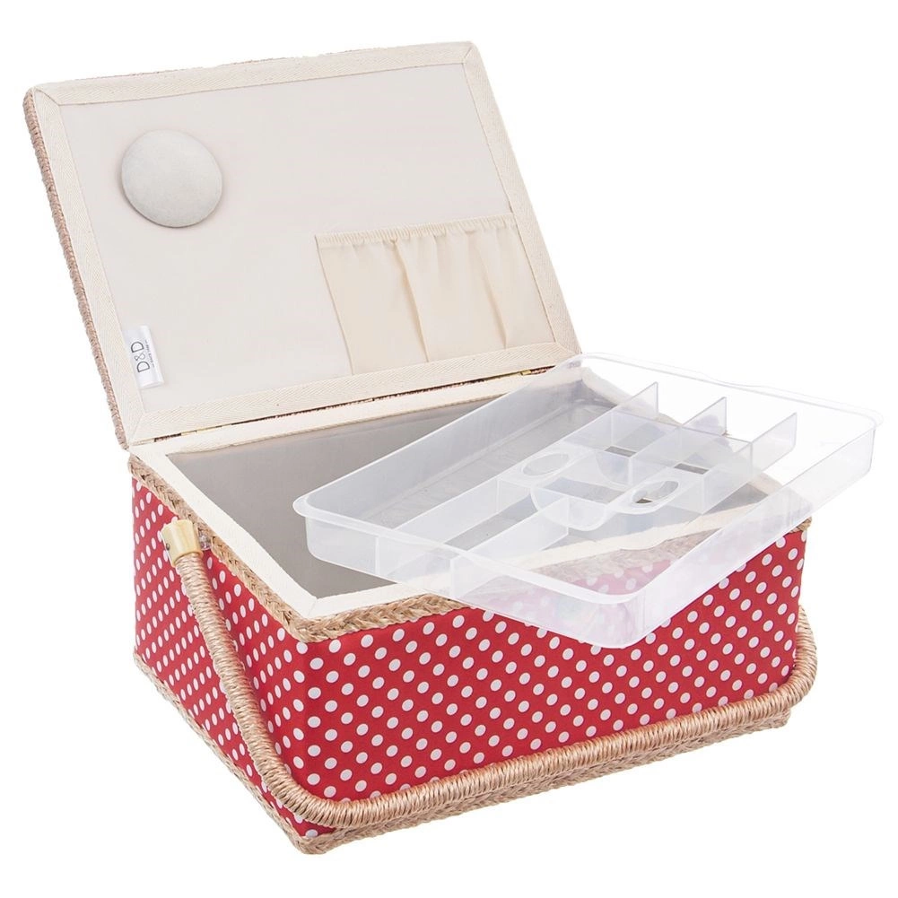 Tento šicí košík kombinuje atraktivní design a promyšlenou organizaci. Tělo košíku je potaženo látkou v červené barvě s bílými puntíky a doplněno pevným uchem pro snadné přenášení. Díky magnetickému zapínání košík bezpečně uzavřete jedním pohybem a obsah zůstane na svém místě i při přenášení.