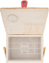 Uvnitř najdete vyjímatelný plastový organizér se 4 přihrádkami pro nitě, jehly, navlékače či knoflíky. Po jeho vyjmutí získáte prostornou komoru pro větší krejčovské pomůcky. Vnitřní strana víka je vybavena elastickou kapsou a jehelníčkem, kam pohodlně zapíchnete špendlíky a jehly. Košík se skvěle hodí i jako organizér na bižuterii.