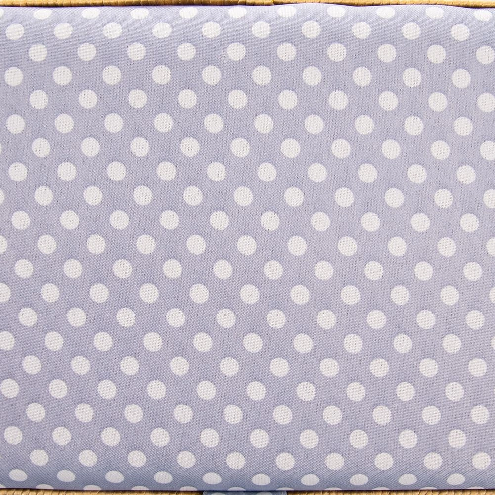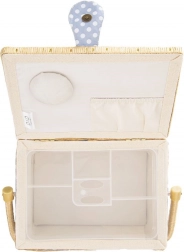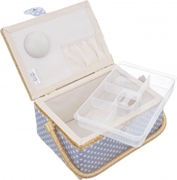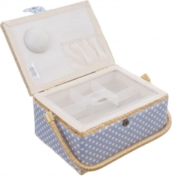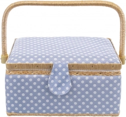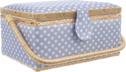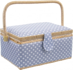 Košík je potažen odolnou textilií v modré barvě s bílými puntíky a doplněn pevnou sklopnou rukojetí pro snadné přenášení. Skvěle poslouží nejen jako niciarka, ale také jako organizér na bižuterii či kreativní potřeby.